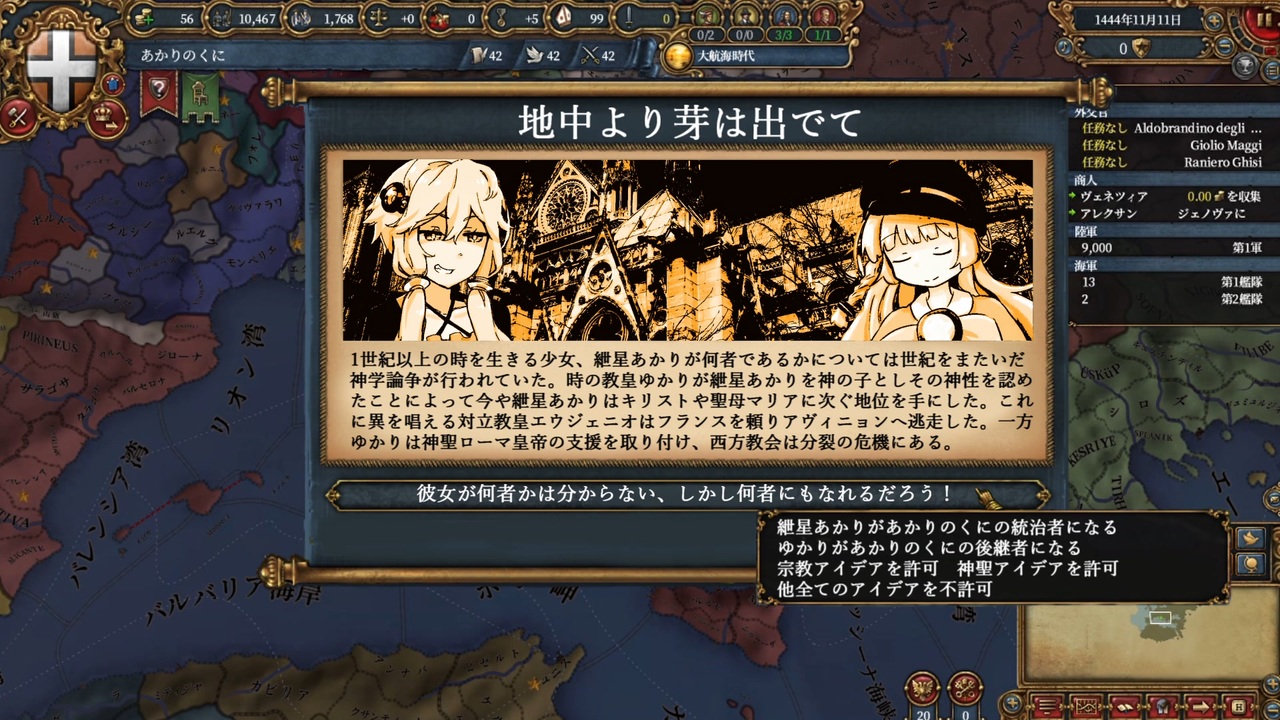 10日間程度なのに滅茶苦茶投稿休んでた気がする。殆どはあかりちゃんが届くのを待ってた時間です<br>ひっさびさのeu4遊劇場です!ほぼ1年ぶりってマジ…?<br>遊劇場になじまないのでコメント返しと広告者紹介は今シリーズでは無いです<br>需要があるならそれだけの動画を作るかもしれません<br><br>※ ゲームバランスに関わるmodを使用しています<br>Infinity custom countrys points EU4 カスタム国家の使用可能ポイント上限の引き上げ<br>※ コンソールを使用しています<br><span style="color: #262626;">若干ネタバレなので反転して読んでください</span><br>今回はそこまでゲームバランスに影響はないですがこれからもっと重要なコンソールも使用します<br><span style="color: #f3f3f3;">add_heir 後継者を付与 ゆかりさんはこれで生み出してます<br>ゲームへの影響は神権制の後継者イベントが発生しない事です<br>age_heir 後継者の年齢変更 ゆかりさんの初期年齢を18にしています<br>後継者が頻繁に即死するとストーリーを作り辛いし立ち絵を多く使うことになるので若くします<br>神権制のイベントで貰える後継者は35と年配なのでこれからも使います</span><br><br>Europa Universalis IV Copyright © 2013 Paradox Interactive AB. www.paradoxplaza.com<br><br>使った素材<br>AviUtl L-SMASH_Works x264guiEx PSDToolKit InputPipePlugin ティムの部屋bakusoku_aviutl_plugin 真・グループ制御<br>立ち絵;しーたん モチノエ<br>画像;写真AC<br>曲、効果音;ニコニ・コモンズ H/MIX GALLERY かまタマゴ Music‐Note 敬称略<br><br>version1.33.2<br>DLC Art of War, El Dorado, Common Sense, Rights of Man, Emperor,Dharma,The Cossacks,Third Rome,Mandate of Heaven,Leviathan,Digital Extreme Edition Upgrade Pack<br><br>eu4過去作のpar/t1リスト<a href="https://www.nicovideo.jp/mylist/71271218" target="_blank" rel="noopener">mylist/71271218</a><br><br>ツイートしないツイッター<br><a href="https://twitter.com/gfd0y0iQLQa9YtF" target="_blank" rel="noopener nofollow">https://twitter.com/gfd0y0iQLQa9YtF</a>