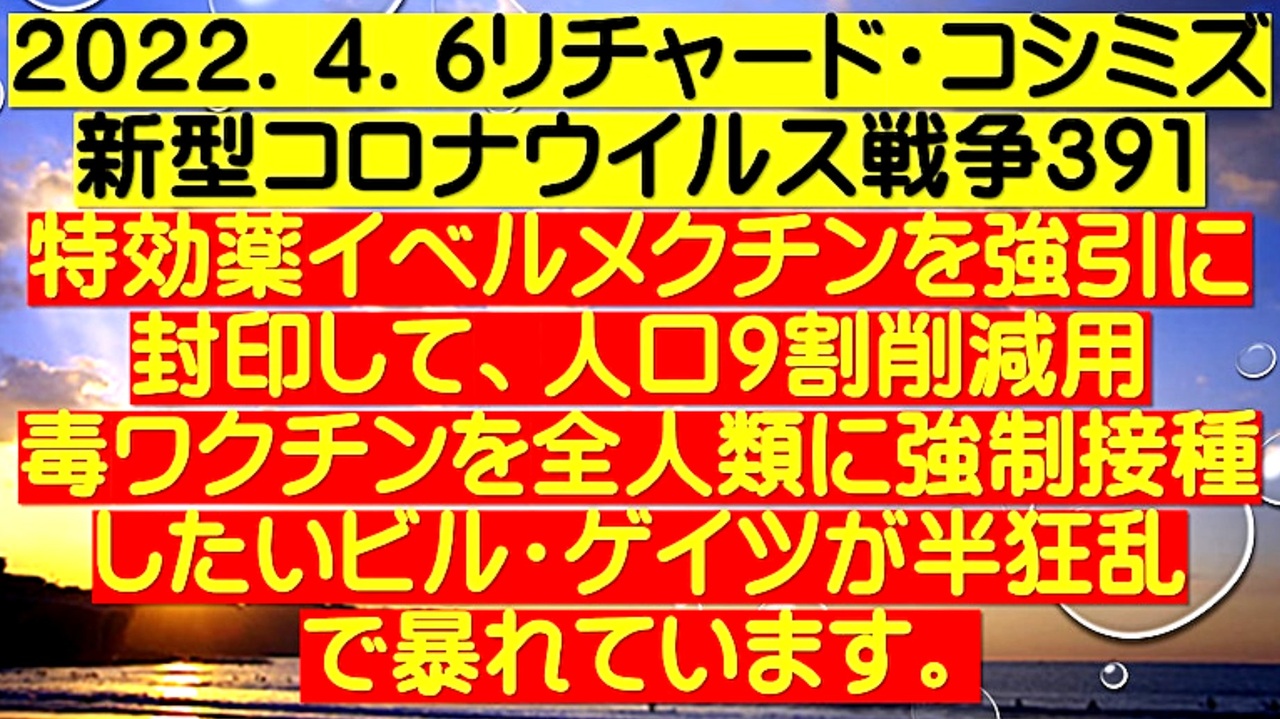 <span style="color: #cc4125;"><strong>【 テーマ:新型コロナウイルス戦争 391 】</strong></span><br><br><span style="color: #ff0000;"><strong>「『 特効薬イベルメクチン 』を強引に封印して、人口9割削減用毒ワクチンを、<br> 全人類に強制接種したいビル・ゲイツが半狂乱で暴れています 」<br><br> </strong></span>◆レムデシビル・モルヌピラビルをFDAが強行承認して、アビガン・イベルメクチンを排除する口実に。<br> FDAは確実にビル・ゲイツとグル。何としても、殺人ワクチンを世界の民に打ちたい殺人鬼ビル・ゲイツ。<br> 次の標的は、「狂犬病・マールブルグ病」。<br><br> ◆コロナウイルスだけでは、ワクチン接種をさせる口実がない。よって、強毒ウイルスを新たに投入し、<br> 新たなワクチンを全人類に打たせたい(狂犬病・マールブルグ病)。<br><br> ◆ウクライナで、飛沫感染型狂犬病を孤島で開発。ロシアに察知され占領された。よって、計画頓挫。<br><br> ◆9.11,3.11同様に核兵器を使用するか?(キエフ中心部で使用し、ロシアに責任転嫁)。<br><br> ◆イベルメクチンの無限の可能性<br><br><span style="color: #38761d;">◆</span><span style="color: #38761d;"><strong>リチャード・コシミズ 公式 ブログ</strong></span><br> <a href="https://ameblo.jp/richardneversurrender/" target="_blank" rel="noopener nofollow">https://ameblo.jp/richardneversurrender/</a><br><br><span style="color: #38761d;">◆</span><span style="color: #38761d;"><strong>リチャード・コシミズ 公式 ホームページ</strong></span><br> <a href="http://richardkoshimizu.boo.jp/" target="_blank" rel="noopener nofollow">http://richardkoshimizu.boo.jp/</a><br><br><span style="color: #38761d;">◆</span><span style="color: #38761d;"><strong>リチャード・コシミズ 講演会 公式 動画ギャラリー</strong></span><br> <a href="http://www.t-sskk.com/richardkoshimizu/video-gallery/index.html" target="_blank" rel="noopener nofollow">http://www.t-sskk.com/richardkoshimizu/video-gallery/index.html</a><br>