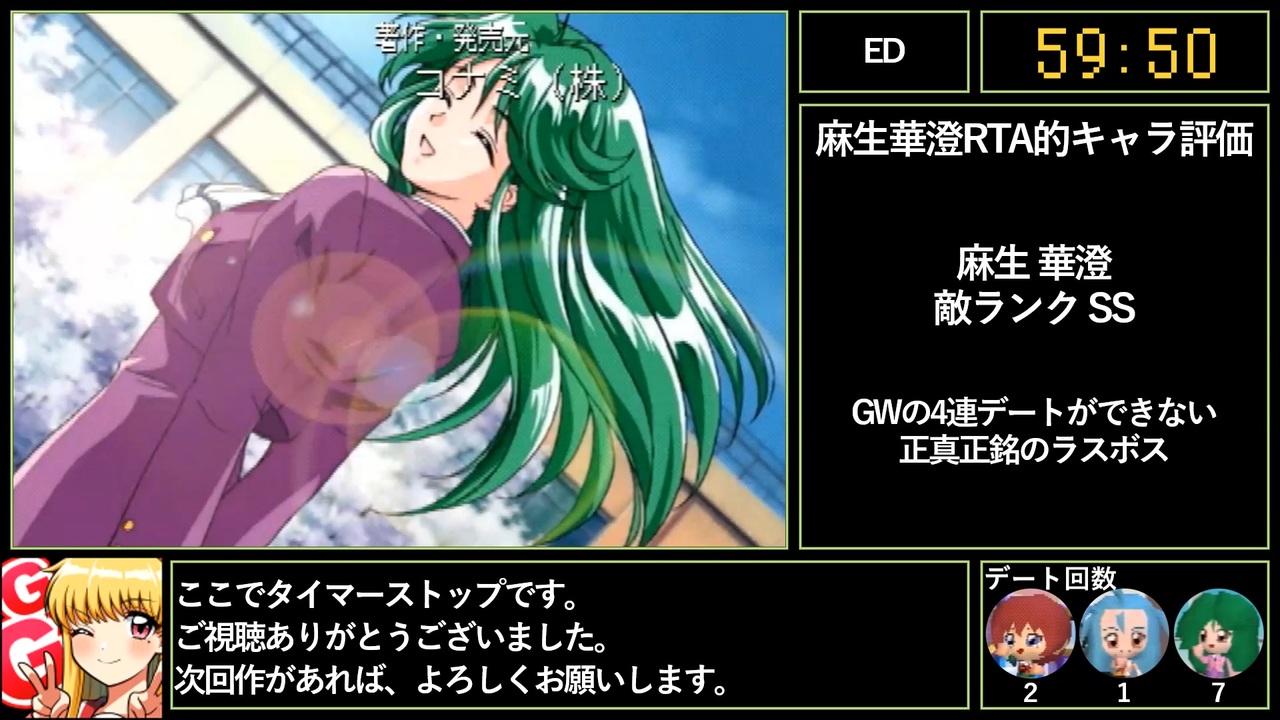 part1: <a href="https://www.nicovideo.jp/watch/sm40208259" class="watch">sm40208259</a> part2: <a href="https://www.nicovideo.jp/watch/sm40249447" class="watch">sm40249447</a><br>これにて麻生華澄RTAは終了です。次回作にご期待ください。<br>TwitterとTwitchをフォローしてくれるとモチベにつながります!<br>Twitter: <a href="https://twitter.com/honda_kazupoon" target="_blank" rel="noopener nofollow">https://twitter.com/honda_kazupoon</a><br>Twitch: <a href="https://www.twitch.tv/kazupoon" target="_blank" rel="noopener nofollow">https://www.twitch.tv/kazupoon</a><br><br>目隠し華澄さんRTA: <a href="https://youtu.be/T8BCmTDFmQs" target="_blank" rel="noopener nofollow">https://youtu.be/T8BCmTDFmQs</a><br>目隠し詩織RTA: <a href="https://youtu.be/8TykDTfb2tE" target="_blank" rel="noopener nofollow">https://youtu.be/8TykDTfb2tE</a><br>他のナンバリングのRTAが気になる人はこの辺りを見てください: <a href="https://youtube.com/playlist?list=PLS8GDGT-lICa1qoqsF8GbI55CjBUIjZpl" target="_blank" rel="noopener nofollow">https://youtube.com/playlist?list=PLS8GDGT-lICa1qoqsF8GbI55CjBUIjZpl</a><br><br>記録の生配信アーカイブ: <a href="https://youtu.be/jdzy1mnxMKw" target="_blank" rel="noopener nofollow">https://youtu.be/jdzy1mnxMKw</a><br>Youtube版: <a href="https://youtu.be/e-Pt0JVYzNk" target="_blank" rel="noopener nofollow">https://youtu.be/e-Pt0JVYzNk</a><br>※VOICEVOX:春日部つむぎを使用しています。