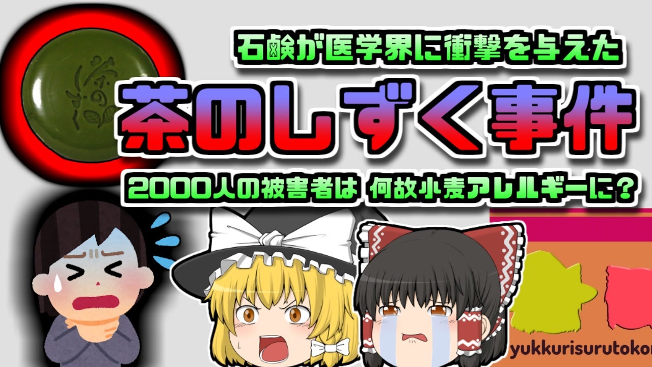 今回紹介するのは、以前から多数リクエストがありました「茶のしずく」という石鹸についてです。<br>2005年からネットや通販などで販売されていたこの石鹸は、約五年間で500万人もの人が購入した、大人気商品でした。<br>しかし、販売してしばらくすると、この石鹸を使用した後、ひどいアレルギー症状を起こしたという相談が、国民生活センターなどに寄せられるようになっていきました。<br>それは2010年になると、爆発的な数に増えるとともに、この石鹸が原因で、なぜか「小麦アレルギー」を発症する人が続出していました。<br><br>この石鹸には「加水分解小麦」という、小麦由来のタンパク質が配合されており、被害者たちは鼻や目などといった粘膜や皮膚から、この成分を大量に吸収し、突然小麦アレルギーを発症していたのです。<br>しかし、これまで食物アレルギーは、経口摂取以外で発症するとは考えられておらず、皮膚からの吸収でアレルギーになるというのは、この時初めて明らかになった、新事実でした。<br><br><a href="#" class="seekTime" data-seekTime="00:29" onclick="seekNicoPlayer('#00:29'); return false;">#00:29</a> 視聴上の注意<br><a href="#" class="seekTime" data-seekTime="1:12" onclick="seekNicoPlayer('#1:12'); return false;">#1:12</a> 大人気だったお茶の石鹸<br><a href="#" class="seekTime" data-seekTime="2:24" onclick="seekNicoPlayer('#2:24'); return false;">#2:24</a> 寄せられた相談<br><a href="#" class="seekTime" data-seekTime="3:22" onclick="seekNicoPlayer('#3:22'); return false;">#3:22</a> 共通のアレルギー<br><a href="#" class="seekTime" data-seekTime="4:26" onclick="seekNicoPlayer('#4:26'); return false;">#4:26</a> 何故石鹸で?<br><a href="#" class="seekTime" data-seekTime="5:41" onclick="seekNicoPlayer('#5:41'); return false;">#5:41</a> 発症の謎<br><a href="#" class="seekTime" data-seekTime="7:18" onclick="seekNicoPlayer('#7:18'); return false;">#7:18</a> 回収・注意<br><a href="#" class="seekTime" data-seekTime="8:50" onclick="seekNicoPlayer('#8:50'); return false;">#8:50</a> その後の裁判<br><a href="#" class="seekTime" data-seekTime="10:10" onclick="seekNicoPlayer('#10:10'); return false;">#10:10</a> どうして石鹸に小麦?<br><a href="#" class="seekTime" data-seekTime="11:31" onclick="seekNicoPlayer('#11:31'); return false;">#11:31</a> アレルギーが起こるメカニズム<br><a href="#" class="seekTime" data-seekTime="12:56" onclick="seekNicoPlayer('#12:56'); return false;">#12:56</a> 判決<br><a href="#" class="seekTime" data-seekTime="14:04" onclick="seekNicoPlayer('#14:04'); return false;">#14:04</a> 現在のA社<br><a href="#" class="seekTime" data-seekTime="14:57" onclick="seekNicoPlayer('#14:57'); return false;">#14:57</a> 身近なもので起きた悲劇<br><br>引用・出展・参考文献<br>厚生労働省<br>ishort.ink/QH1B<br>独立行政法人国民生活センター<br>ishort.ink/KD3m<br>加水小麦分解物を含有する<br>「旧茶のしずく石鹸」による危害状況について<br>ishort.ink/gXmU<br>東京地方裁判所<br>茶のしずく石鹸東京訴訟<br>ishort.ink/d9Tv<br>佐賀新聞<br>ishort.ink/zMgg<br>医療NEWS<br>ishort.ink/W7CS<br>朝日新聞アピタル<br>ishort.ink/JsfR<br>医療法人全人会<br>小西統合医療内科<br>ishort.ink/tmzk<br>Wikipedia<br>ishort.ink/7UC6<br>妹尾小児科<br>小麦アレルギー<br>ishort.ink/5cZh<br><br>その他視聴者提供資料など<br><br />※この動画は過去の事件を知り、現在でも同じことが発生する危険性を再認識、関与しないように促すための動画であり、視聴者を扇動、動揺を誘うためのコンテンツではありません。<br><br>ご要望にお応えして、メンバーシップの開設を行いました。<br>下記URLからも登録可能ですので、ご興味がある方は是非ご参加ください。<br><a href="https://www.youtube.com/channel/UCcT5a1J7XJW7CLYI2RKl4pw/join" target="_blank" rel="noopener nofollow">https://www.youtube.com/channel/UCcT5a1J7XJW7CLYI2RKl4pw/join</a><br><br><br>Twitter<br>→<a href="https://twitter.com/yukkurisurutoko" target="_blank" rel="noopener nofollow">https://twitter.com/yukkurisurutoko</a><br><br>取り急ぎ、簡易的にですがマイリストを作りました。<br>【ゆっくり解説】事故・事件関係紹介リスト <br><a href="https://www.nicovideo.jp/mylist/71034319" target="_blank" rel="noopener nofollow">https://www.nicovideo.jp/mylist/71034319</a><br>【ゆっくり解説】放射線系事故<br><a href="https://www.nicovideo.jp/mylist/71034368" target="_blank" rel="noopener nofollow">https://www.nicovideo.jp/mylist/71034368</a><br>【ゆっくり解説】鉄道系事故・事件関連<br><a href="https://www.nicovideo.jp/mylist/71034379" target="_blank" rel="noopener nofollow">https://www.nicovideo.jp/mylist/71034379</a>