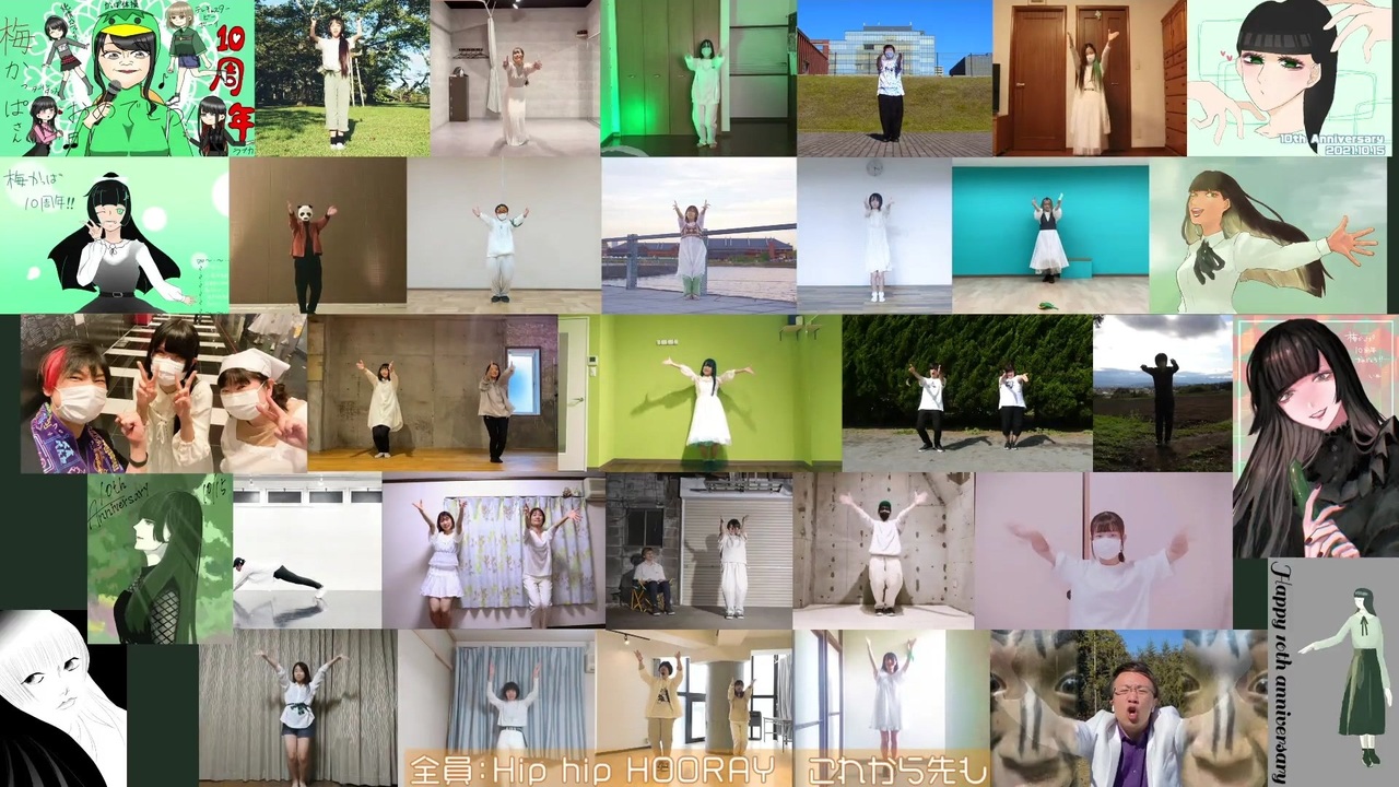 <span style="color: #38761d;">梅かっぱは2021年10月15日にニコニコでの活動が10周年、そして4月6日に22歳の誕生日を迎えました!<br>10年という区切りの年、なにか特別なことがしたい!とTwitterで募集したら全部で48人の方が作品を送ってくれました!!<br>人生で一番特別な動画になりました、本当にありがとう!!<br><br>次の10年もよろしくネ!!100年先もカパテャと歩んでください!!<br><br><br><br>楽曲本家様 SINGERS A <a href="https://www.nicovideo.jp/watch/sm23328696" class="watch">sm23328696</a><br> SINGERS B <a href="https://www.nicovideo.jp/watch/sm23348371" class="watch">sm23348371</a><br> VOCALOIDS <a href="https://www.nicovideo.jp/watch/sm23304692" class="watch">sm23304692</a><br><br>振付本家様 <a href="https://www.nicovideo.jp/watch/sm24568679" class="watch">sm24568679</a></span><br><br><br><br><span style="color: #990000;">踊り(順不同、敬称略)</span><br><span style="color: #38761d;">凛々 ぽるし しょこら 稚菜 四 浅葱 咲来花 花ママ サル きつねこあら ゆうひ みぁぐ ひぃ なごみ ギと 小桜テツナ xizz(ぢずん) たいちP さやかぽてと さつたま丼 サセ きり ガブさん お皿 あぶにぃ Y字バランスのせいな Tee Pandaro 水瀬明日翔 居眠りおん momotaro あやななな</span><br><br><span style="color: #990000;">歌(順不同、敬称略)</span><br><span style="color: #38761d;">四 御飯deth江 ぴーたん ぺすか キュ</span><br><br><span style="color: #990000;">絵(順不同、敬称略)</span><br><span style="color: #38761d;">いぬ NANA7 おにぎりは塩派 ぬん ヘヴィリン 水瀬明日翔 睡蓮 PIERRE</span><br><br><span style="color: #990000;">メッセージ(順不同、敬称略)</span><br><span style="color: #38761d;">季節 デスレガ あやぱぱちゃん キュ とらぱん おにぎりは塩派</span><br><br><span style="color: #990000;">写真</span><br><span style="color: #38761d;">百花繚乱さん</span><br><br><span style="color: #990000;">Special Thanks</span><br><span style="color: #38761d;">ギと</span>