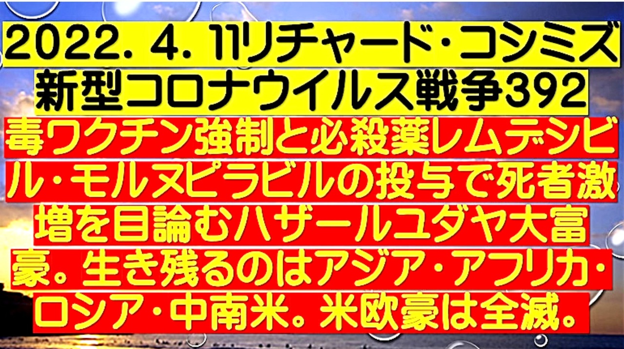 <span style="color: #cc4125;"><strong>【 テーマ:新型コロナウイルス戦争 392 】</strong></span><br><br><span style="color: #ff0000;"><strong>「 毒ワクチン強制と必殺薬『 レムデシビル・モルヌピラビル 』の投与で死者激増を目論む<br> ハザールユダヤ大富豪。生き残るのは『 アジア・アフリカ・ロシア・中南米 』。<br> 『 米欧豪 』は全滅 」<br><br> </strong></span>◆新型コロナワクチンは感染を防ぐ目的ではない。ワクチン接種により変異株に感染しやすくさせ、<br> スパイクタンパクを産生して、血栓症と免疫不全を引き起こして、ワクチン接種者を殺害するの<br> が目的である。<br><br> ◆『新型コロナワクチンの大量殺人目的』を知られては困るため、ワクチン後遺症が大問題になっ<br> ている今も、マスコミは、一切報道しない。政府も言及しない。<br> 国民を騙して、3回目接種を強行中。<br><br><span style="color: #38761d;">◆</span><span style="color: #38761d;"><strong>リチャード・コシミズ 公式 ブログ</strong></span><br> <a href="https://ameblo.jp/richardneversurrender/" target="_blank" rel="noopener nofollow">https://ameblo.jp/richardneversurrender/</a><br><br><span style="color: #38761d;">◆</span><span style="color: #38761d;"><strong>リチャード・コシミズ 公式 ホームページ</strong></span><br> <a href="http://richardkoshimizu.boo.jp/" target="_blank" rel="noopener nofollow">http://richardkoshimizu.boo.jp/</a><br><br><span style="color: #38761d;">◆</span><span style="color: #38761d;"><strong>リチャード・コシミズ 講演会 公式 動画ギャラリー</strong></span><br> <a href="http://www.t-sskk.com/richardkoshimizu/video-gallery/index.html" target="_blank" rel="noopener nofollow">http://www.t-sskk.com/richardkoshimizu/video-gallery/index.html</a><br>
