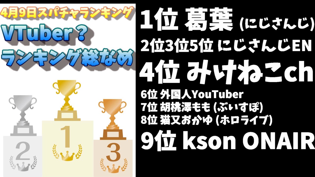 2022年4月9日の全世界YouTubeスーパーチャットランキングを紹介する動画です。大半がVTuberが占めている、いつのまにか人気になったにじさんじENが上位にランクインしている、元VTuberがランクインしているなど興味深い結果となっています。<br><br>引用<br><a href="https://playboard.co/en/youtube-ranking/most-superchatted-all-channels-in-worldwide-daily?period=1649462400" target="_blank" rel="noopener nofollow">https://playboard.co/en/youtube-ranking/most-superchatted-all-channels-in-worldwide-daily?period=1649462400</a><br><br>今後の 製作予定動画<br>元にじさんじ運営幹部いわなが社長、新しい箱を立ち上げる<br>鳴神裁「にじさんじの野良猫俺のこと好きだよな?」<br>にじさんじ×DLsite ASMRコラボ5~6弾販売中止<br>【悲報】鳴神裁「裁判をすっ飛ばして逮捕はあり得ない」<br>にじさんじ引退者まとめPart.3<br>にじさんじとストーカー被害まとめ<br>【悲報】にじさんじライバー、一本満足バーを一度に二本食べてしまう<br><br>公開マイリスト<br>1 <a href="https://www.nicovideo.jp/mylist/66855587" target="_blank" rel="noopener nofollow">https://www.nicovideo.jp/mylist/66855587</a><br>2 <a href="https://www.nicovideo.jp/mylist/71980663" target="_blank" rel="noopener nofollow">https://www.nicovideo.jp/mylist/71980663</a><br>Youtube <a href="https://www.youtube.com/channel/UCzYQPx8MeE99DUkW9Y_txJw" target="_blank" rel="noopener nofollow">https://www.youtube.com/channel/UCzYQPx8MeE99DUkW9Y_txJw</a><br>twitter <a href="https://twitter.com/V_Virgin_Mary" target="_blank" rel="noopener nofollow">https://twitter.com/V_Virgin_Mary</a><br><br>使用素材<br>高品質なフリー動画素材 - Pixabay <a href="https://pixabay.com/ja/videos" target="_blank" rel="noopener nofollow">https://pixabay.com/ja/videos</a>