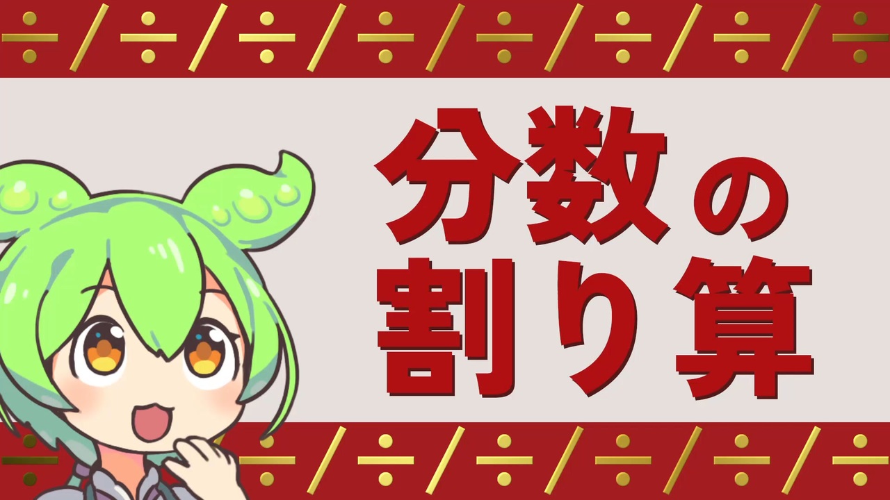 ずんだもんが分数の割り算をするようです。<br>小学5年生以降向け(目安)<br><br>動画内で<br>誤って「母線」と書いているところは、<br>正しくは「括線(かっせん)」や「分数線」というそうです。<br>お詫びして訂正いたします。<br><br>【目次】<br>00:38 一般的な計算方法<br>01:16 逆数をかける理由<br>03:58 逆数とは<br>04:52 想像しやすい例え話<br>07:02 割る数と答えの大小関係<br><br>【音声素材】<br>VOICEVOX:ずんだもん, ヒホ様 <a href="https://voicevox.hiroshiba.jp/" target="_blank" rel="noopener nofollow">https://voicevox.hiroshiba.jp/</a><br>VOICEVOX:春日部つむぎ 同上<br>効果音ラボ様 <a href="https://soundeffect-lab.info/" target="_blank" rel="noopener nofollow">https://soundeffect-lab.info/</a><br><br>【BGM素材】<br>Quizman, shimtone様 <a href="https://dova-s.jp/bgm/play16329.html" target="_blank" rel="noopener nofollow">https://dova-s.jp/bgm/play16329.html</a><br>ぼく、こがねむし!, MAKOOTO様 <a href="https://commons.nicovideo.jp/material/nc222522" target="_blank" rel="noopener nofollow">https://commons.nicovideo.jp/material/nc222522</a><br><br>【画像素材】<br>ずんだもん立ち絵素材, 坂本アヒル様 <a href="https://seiga.nicovideo.jp/seiga/im10788496" target="_blank" rel="noopener nofollow">https://seiga.nicovideo.jp/seiga/im10788496</a><br>春日部つむぎ立ち絵素材, 坂本アヒル様 <a href="https://seiga.nicovideo.jp/seiga/im10849150" target="_blank" rel="noopener nofollow">https://seiga.nicovideo.jp/seiga/im10849150</a><br>ずんだもん立ち素材, akihiyo様 <a href="https://seiga.nicovideo.jp/seiga/im10792934" target="_blank" rel="noopener nofollow">https://seiga.nicovideo.jp/seiga/im10792934</a><br>広い公園(日中), ちんみり様 <a href="https://min-chi.material.jp/" target="_blank" rel="noopener nofollow">https://min-chi.material.jp/</a><br>車, Vehicle Illust様 <a href="https://vehicle-illust.com/illust/051_kei-car2/" target="_blank" rel="noopener nofollow">https://vehicle-illust.com/illust/051_kei-car2/</a><br>赤リンゴ, DESIGNALIKIE様 <a href="https://illustimage.com/?id=21631" target="_blank" rel="noopener nofollow">https://illustimage.com/?id=21631</a><br>切ったリンゴ, DESIGNALIKIE様 <a href="https://illustimage.com/?id=21636" target="_blank" rel="noopener nofollow">https://illustimage.com/?id=21636</a><br>和紙背景, BEIZ images様 <a href="https://www.beiz.jp/" target="_blank" rel="noopener nofollow">https://www.beiz.jp/</a>