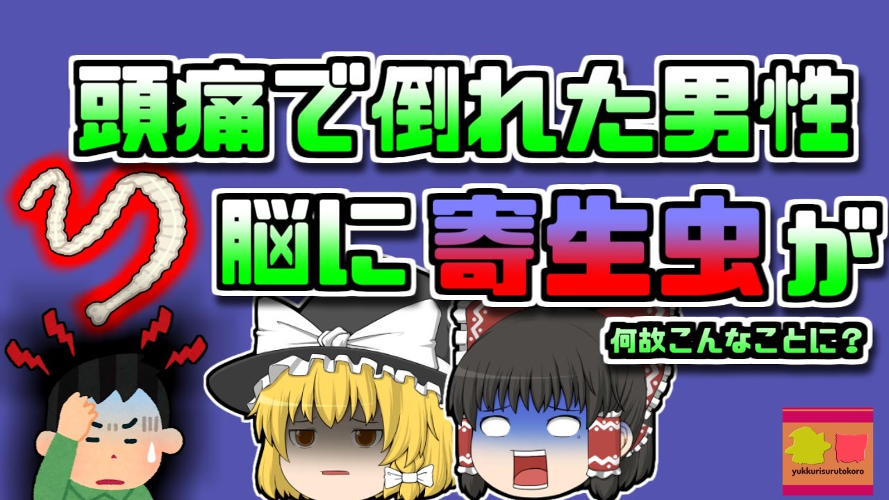 今回紹介するのは、頭痛に関する事例です。<br>アメリカ合衆国マサチューセッツ州ボストン市に暮らす男性「Aさん」は、自宅の庭で意識を失っていたところを、近隣住民に発見され、病院に搬送されて行きました。<br>病院で処置を受け、意識を取り戻した彼は「突然激しい頭痛に襲われて、それからの記憶がない」と話します。<br>脳の疾患が疑われたため、医師は頭部のMRI検査を行いました。<br>すると、彼の脳は一部が「石灰化」してしまっており、これが原因で頭痛を起こしているものと判明。<br>当初は脳が石灰化してしまう難病ではないかと考えられていましたが、その後の調べで、彼の脳には、寄生虫である「サナダムシ」の幼虫が入り込み、それが原因で石灰化、頭痛などを引き起こしていたことがわかりました。<br><br>なぜ、腸に寄生することで有名なサナダムシが、脳にまでいどうしていたのでしょうか?<br><br><a href="#" class="seekTime" data-seekTime="00:43" onclick="seekNicoPlayer('#00:43'); return false;">#00:43</a> 視聴上の注意<br><a href="#" class="seekTime" data-seekTime="1:14" onclick="seekNicoPlayer('#1:14'); return false;">#1:14</a> 現地の説明<br><a href="#" class="seekTime" data-seekTime="2:34" onclick="seekNicoPlayer('#2:34'); return false;">#2:34</a> 発見された男性<br><a href="#" class="seekTime" data-seekTime="3:16" onclick="seekNicoPlayer('#3:16'); return false;">#3:16</a> 頭痛<br><a href="#" class="seekTime" data-seekTime="4:07" onclick="seekNicoPlayer('#4:07'); return false;">#4:07</a> 頭部の検査<br><a href="#" class="seekTime" data-seekTime="4:52" onclick="seekNicoPlayer('#4:52'); return false;">#4:52</a> 石灰化<br><a href="#" class="seekTime" data-seekTime="5:40" onclick="seekNicoPlayer('#5:40'); return false;">#5:40</a> 別の原因<br><a href="#" class="seekTime" data-seekTime="6:25" onclick="seekNicoPlayer('#6:25'); return false;">#6:25</a> サナダムシ<br><a href="#" class="seekTime" data-seekTime="7:32" onclick="seekNicoPlayer('#7:32'); return false;">#7:32</a> 脳に移動すると…<br><a href="#" class="seekTime" data-seekTime="8:10" onclick="seekNicoPlayer('#8:10'); return false;">#8:10</a> 手洗いの重要性<br><a href="#" class="seekTime" data-seekTime="9:01" onclick="seekNicoPlayer('#9:01'); return false;">#9:01</a> 原因不明<br><a href="#" class="seekTime" data-seekTime="9:17" onclick="seekNicoPlayer('#9:17'); return false;">#9:17</a> その後<br><a href="#" class="seekTime" data-seekTime="10:16" onclick="seekNicoPlayer('#10:16'); return false;">#10:16</a> 他にも…<br><a href="#" class="seekTime" data-seekTime="10:35" onclick="seekNicoPlayer('#10:35'); return false;">#10:35</a> 未然に防ぐ対策<br><br>引用・出展・参考文献<br>厚生労働省検疫所<br>ishort.ink/qbFn<br>難病情報センター<br>ishort.ink/Gz9t<br>Wikipedia<br>ishort.ink/sahq<br>ishort.ink/wNTd<br>グローバルヘルスケアクリニック<br>ishort.ink/RBJo<br>大幸薬品<br>ishort.ink/4Ssv<br> 新百合ヶ丘総合病院脳外科<br>ishort.ink/SAZv<br>スクールウィズ<br>ishort.ink/qFHu<br><br><br />※この動画は過去の事件を知り、現在でも同じことが発生する危険性を再認識、関与しないように促すための動画であり、視聴者を扇動、動揺を誘うためのコンテンツではありません。<br><br>ご要望にお応えして、メンバーシップの開設を行いました。<br>下記URLからも登録可能ですので、ご興味がある方は是非ご参加ください。<br><a href="https://www.youtube.com/channel/UCcT5a1J7XJW7CLYI2RKl4pw/join" target="_blank" rel="noopener nofollow">https://www.youtube.com/channel/UCcT5a1J7XJW7CLYI2RKl4pw/join</a><br><br><br>Twitter<br>→<a href="https://twitter.com/yukkurisurutoko" target="_blank" rel="noopener nofollow">https://twitter.com/yukkurisurutoko</a><br><br>取り急ぎ、簡易的にですがマイリストを作りました。<br>【ゆっくり解説】事故・事件関係紹介リスト <br><a href="https://www.nicovideo.jp/mylist/71034319" target="_blank" rel="noopener nofollow">https://www.nicovideo.jp/mylist/71034319</a><br>【ゆっくり解説】放射線系事故<br><a href="https://www.nicovideo.jp/mylist/71034368" target="_blank" rel="noopener nofollow">https://www.nicovideo.jp/mylist/71034368</a><br>【ゆっくり解説】鉄道系事故・事件関連<br><a href="https://www.nicovideo.jp/mylist/71034379" target="_blank" rel="noopener nofollow">https://www.nicovideo.jp/mylist/71034379</a>