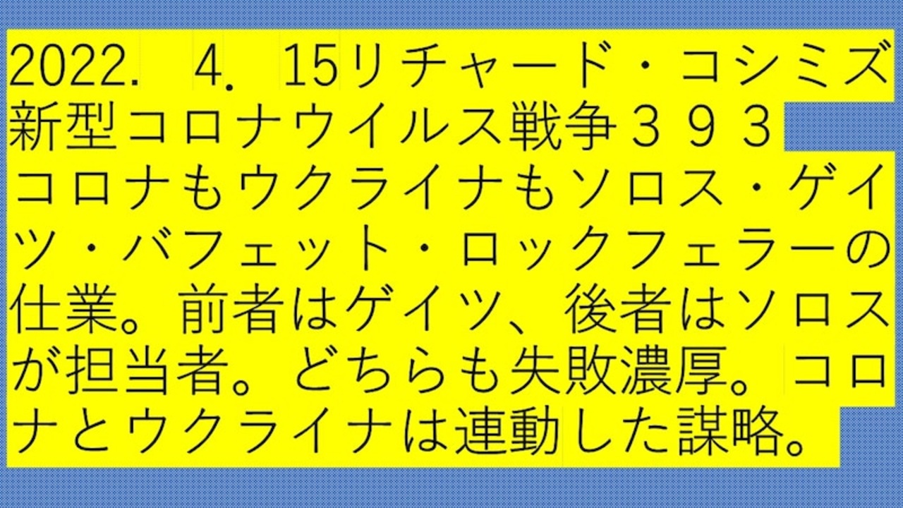 <span style="color: #cc4125;"><strong>【 テーマ:新型コロナウイルス戦争 393 】</strong></span><br><br><span style="color: #ff0000;"><strong>「『 新型コロナ 』も『 ウクライナ 』も、ジョージ・ソロス,ビル・ゲイツ,ウォーレン・バフェット,<br> ロックフェラーの仕業。前者はビル・ゲイツ、後者はジョージ・ソロスが担当者。どちらも失敗濃厚。<br> 『 新型コロナ 』と『 ウクライナ 』は連動した謀略 」</strong></span><br><br><span style="color: #38761d;">◆</span><span style="color: #38761d;"><strong>リチャード・コシミズ 公式 ブログ</strong></span><br> <a href="https://ameblo.jp/richardneversurrender/" target="_blank" rel="noopener nofollow">https://ameblo.jp/richardneversurrender/</a><br><br><span style="color: #38761d;">◆</span><span style="color: #38761d;"><strong>リチャード・コシミズ 公式 ホームページ</strong></span><br> <a href="http://richardkoshimizu.boo.jp/" target="_blank" rel="noopener nofollow">http://richardkoshimizu.boo.jp/</a><br><br><span style="color: #38761d;">◆</span><span style="color: #38761d;"><strong>リチャード・コシミズ 講演会 公式 動画ギャラリー</strong></span><br> <a href="http://www.t-sskk.com/richardkoshimizu/video-gallery/index.html" target="_blank" rel="noopener nofollow">http://www.t-sskk.com/richardkoshimizu/video-gallery/index.html</a><br>