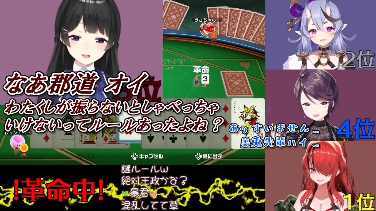 これがにじさんじの上下社会か~<br>こわぁ…<br><br>本家参考動画<br>・レイン・パターソン<br>【世界のアソビ大全51】下剋上大富豪【レイン・パターソン/にじさんじ】<br><a href="https://youtu.be/8FV18M079EI" target="_blank" rel="noopener nofollow">https://youtu.be/8FV18M079EI</a><br><br>参考元チャンネル&Twitter<br>・月ノ美兎<br><a href="https://www.youtube.com/channel/UCD-miitqNY3nyukJ4Fnf4_A" target="_blank" rel="noopener nofollow">https://www.youtube.com/channel/UCD-miitqNY3nyukJ4Fnf4_A</a><br><a href="https://twitter.com/MitoTsukino" target="_blank" rel="noopener nofollow">https://twitter.com/MitoTsukino</a><br>・竜胆尊<br><a href="https://www.youtube.com/channel/UCPvGypSgfDkVe7JG2KygK7A" target="_blank" rel="noopener nofollow">https://www.youtube.com/channel/UCPvGypSgfDkVe7JG2KygK7A</a><br><a href="https://twitter.com/RindouMikoto" target="_blank" rel="noopener nofollow">https://twitter.com/RindouMikoto</a><br>・郡道美玲<br><a href="https://www.youtube.com/channel/UCeShTCVgZyq2lsBW9QwIJcw" target="_blank" rel="noopener nofollow">https://www.youtube.com/channel/UCeShTCVgZyq2lsBW9QwIJcw</a><br><a href="https://twitter.com/g9v9g_mirei" target="_blank" rel="noopener nofollow">https://twitter.com/g9v9g_mirei</a><br>・レイン・パターソン<br><a href="https://www.youtube.com/channel/UCRm6lqtdxs_Qo6HeL-SRQ-w" target="_blank" rel="noopener nofollow">https://www.youtube.com/channel/UCRm6lqtdxs_Qo6HeL-SRQ-w</a><br><a href="https://twitter.com/Lain_Paterson" target="_blank" rel="noopener nofollow">https://twitter.com/Lain_Paterson</a><br><br>ニコニコのダイコンマンリスト<br>「バーチャルYouTuberシリーズ」↓<br><a href="https://www.nicovideo.jp/mylist/62551838" target="_blank" rel="noopener">mylist/62551838</a><br>「バーチャルYouTuberシリーズ2」↓<br><a href="https://www.nicovideo.jp/mylist/67858437" target="_blank" rel="noopener">mylist/67858437</a><br>「バーチャルYouTuberシリーズ3」↓<br><a href="https://www.nicovideo.jp/mylist/71340675" target="_blank" rel="noopener">mylist/71340675</a><br><br>ダイコンマンのTwitter<br><a href="https://twitter.com/Daikon_Man_V" target="_blank" rel="noopener nofollow">https://twitter.com/Daikon_Man_V</a>