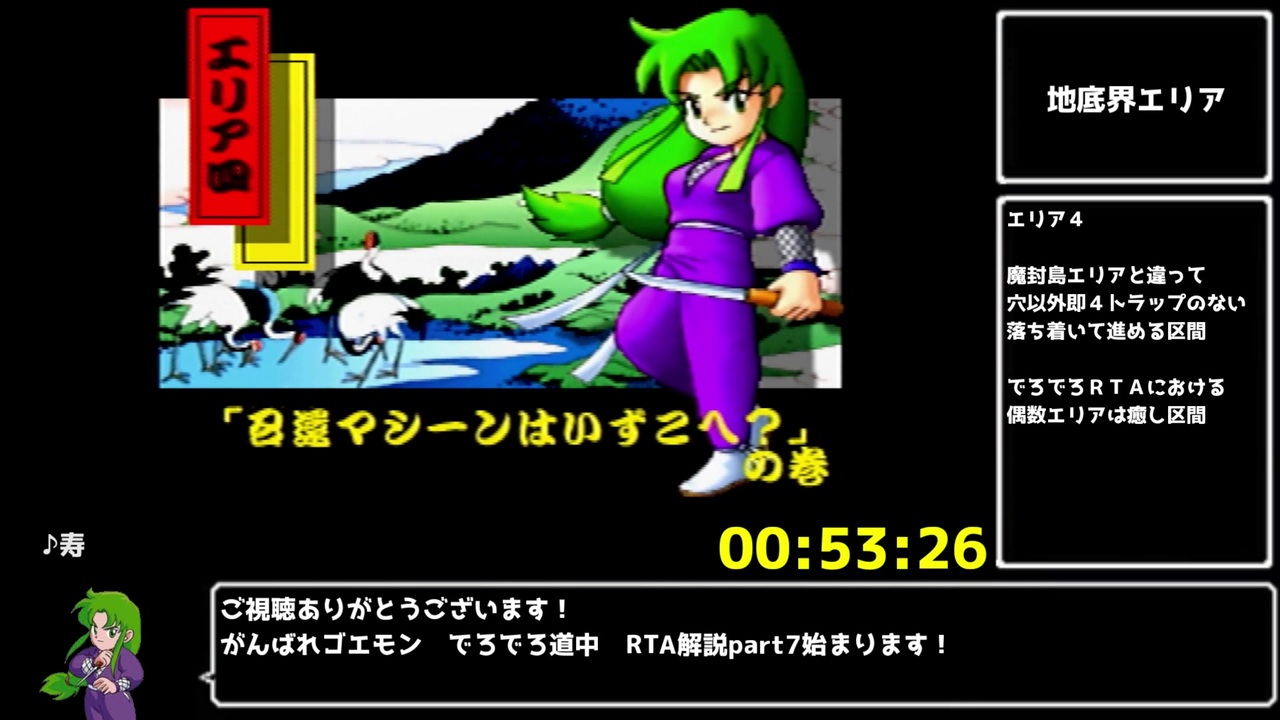 前⇒<a href="https://www.nicovideo.jp/watch/sm40275670" class="watch">sm40275670</a><br>次⇒<a href="https://www.nicovideo.jp/watch/sm40394238" class="watch">sm40394238</a><br>マイリスト⇒<a href="https://www.nicovideo.jp/mylist/72797482" target="_blank" rel="noopener">mylist/72797482</a><br><br>地底界エリア道中<br>地底界エリアは前エリアの魔封島エリアと違って即ミスのトラップが穴しかないのでそこまで難しくない区間となります<br>でろでろ道中RTAでは偶数エリア(竜宮、地底界)はそこまで難しくない癒し区間となっています<br><br><br>また、今回の解説で出てくるRTA技やバグについては別の動画(<a href="https://www.nicovideo.jp/watch/sm40071366" class="watch">sm40071366</a>)にて説明しており、こちらをご視聴いただいた前提でRTA解説をしております。<br><br><br>計測開始:ゲームをリセットした瞬間<br>計測終了:ラスボスのドウチュウ鬼を撃破し画面がホワイトアウトした瞬間<br><br>普段はTwitch( <a href="https://www.twitch.tv/koryuta_dayo" target="_blank" rel="noopener nofollow">https://www.twitch.tv/koryuta_dayo</a> )にてRTA配信をやっています<br>この動画をきっかけに、普段のRTA配信にも興味を持っていただけたら幸いです<br><br>ゴエモンRTA用のdiscordのサーバーを作ってみました!<br>(64作品が主ですが)ゴエモンRTAについて詳しく知りたい方はご利用ください!<br>⇒<a href="https://discord.gg/s2dV7XjPJS" target="_blank" rel="noopener nofollow">https://discord.gg/s2dV7XjPJS</a><br><br>