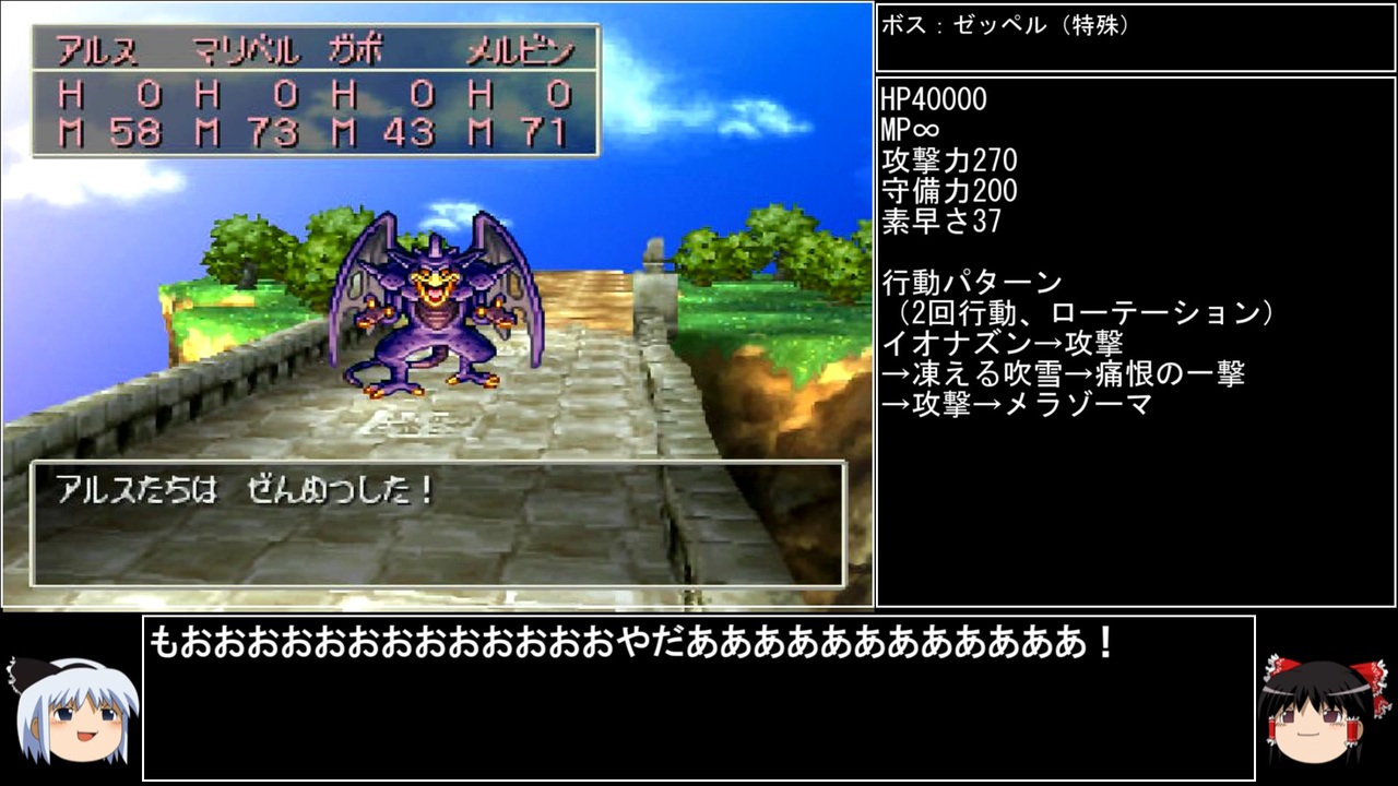2回行動はやぶさぎり投稿による怒涛の3/4本目! そしてサムネもおおおおおやだあああああ!<br>チャンネル登録者数が950を突破していよいよ1000が見えてきましたが、ゴールデンウィークと重なったらワンチャンスーパーハイテンションでつるぎのまい投稿もありえるかも……?<br>ラッキーパネルーっ! いそいでくれーっ!!<br><br>(※ツイッターでも呟きましたが、共通説明文に互換機の旨を記載しました)<br><br>前→<a href="https://www.nicovideo.jp/watch/sm40289902" class="watch">sm40289902</a>(※ラジオ回→<a href="https://www.nicovideo.jp/watch/sm40304314" class="watch">sm40304314</a>) 次→<a href="https://www.nicovideo.jp/watch/sm40356337" class="watch">sm40356337</a><br><br>YouTube版→<a href="https://youtu.be/328BKhLhcjQ" target="_blank" rel="noopener nofollow">https://youtu.be/328BKhLhcjQ</a><br><br><br>※動画の大きさが変わる方は、お手数ですが設定→画質を自動から〇pに変えると解決します。<br>※一部機種は互換機を使用してのプレイとなります。<br><br>縛りルール(不明点はシリーズのQ&Aを参照)<br>①使った武器・防具・装飾品・道具・呪文・特技・一部特殊施設(メダル王・カジノ・移民の町)・職業(3,6,7)・仲間モンスター(4,5,6,8+7の職業)は次以降のシリーズで使用禁止。<br>(NPCキャラが使用した装備や呪文を含む。売却及び錬金素材としても使用扱い)<br><br>②裏技・バグ技の禁止。<br><br>③逃走禁止&戦闘終了時は全員生存。<br><br>④レベルを上げ過ぎない。<br>ダンジョンやボスは公式ガイドブックに記載されたレベル+3まで。<br>ラスボスは全ての呪文を習得するレベル+3程度までに収める。<br><br>⑤裏ボスも規定回数、規定ターン以内に倒す。<br>(6の裏ダンジョン突入時のみ、条件を満たすため①の職業を解禁)<br><br>(おまけ)<br>宝は可能なものに限り全回収。<br>5と6は同一モンスターの仲間不可。<br>回避可能なボスも全て倒す。<br><br><br>この動画で利用している株式会社スクウェア・エニックスを代表とする共同著作者が権利を所有する著作物及びスギヤマ工房有限会社が権利を所有する楽曲の転載・配布は禁止いたします。<br>(C) ARMOR PROJECT/BIRD STUDIO/SQUARE ENIX All Rights Reserved.<br>(C) SUGIYAMA KOBO (P) SUGIYAMA KOBO<br><br>AquesTalk2ライセンスID:AQTK2WINUSR23122185<br /><br><br>❤いいねを押していただけるとモチベーションと投稿速度が上がるので宜しくお願い致します!<br><br>作者ツイッター→ <a href="https://twitter.com/nig0117" target="_blank" rel="noopener nofollow">https://twitter.com/nig0117</a><br>PIXIV FANBOX→ <a href="https://sutanokeiji.fanbox.cc/" target="_blank" rel="noopener nofollow">https://sutanokeiji.fanbox.cc/</a><br><br>( 以前はWEB小説書いてました→ <a href="https://kakuyomu.jp/works/1177354054884910267" target="_blank" rel="noopener nofollow">https://kakuyomu.jp/works/1177354054884910267</a> )