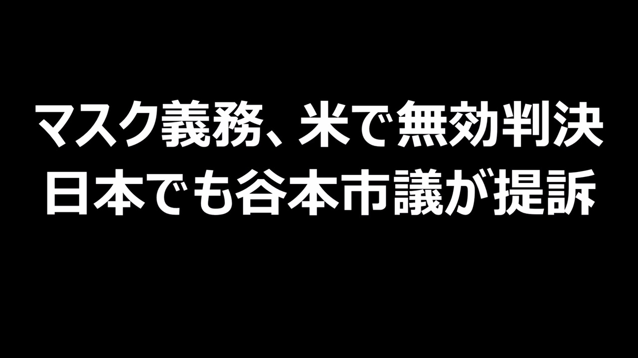 公共交通機関でのマスク義務、米で「無効」の判決…CDCの理由説明が不十分と指摘<br><a href="https://www.yomiuri.co.jp/world/20220419-OYT1T50087/" target="_blank" rel="noopener nofollow">https://www.yomiuri.co.jp/world/20220419-OYT1T50087/</a><br>マスク拒否の呉市議、降機命令の取り消しなど求め提訴へ 航空会社と国相手に<br><a href="https://news.yahoo.co.jp/articles/934b2bf37a9c80c6784140c52545c23b63163b7e" target="_blank" rel="noopener nofollow">https://news.yahoo.co.jp/articles/934b2bf37a9c80c6784140c52545c23b63163b7e</a><br>マスク拒否の谷本市議 機内から降ろされる<br><a href="https://www.nicovideo.jp/watch/sm40014268" target="_blank" rel="noopener nofollow">https://www.nicovideo.jp/watch/sm40014268</a><br>全米50州でマスク着用義務なしに<br><a href="https://www.nicovideo.jp/watch/sm40159577" target="_blank" rel="noopener nofollow">https://www.nicovideo.jp/watch/sm40159577</a><br>