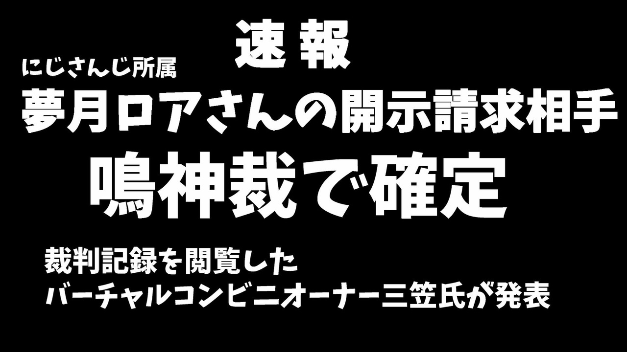 2022年4月19日、個人勢VTuberのバーチャルコンビニオーナー三笠さんがにじさんじ所属のVTuber夢月ロアさんの裁判記録を閲覧した結果、発信者情報開示請求の相手が鳴神裁だと確定したと自身の配信内で発表されました。詳しくは三笠氏の配信アーカイブ( <a href="https://youtu.be/T5k-1ZpdV2E" target="_blank" rel="noopener nofollow">https://youtu.be/T5k-1ZpdV2E</a> ) をご参照ください。<br><br>引用<br>バーチャルコンビニオーナー三笠さんのアーカイブ<br>夢月ロアさんによる発信者情報開示請求の対象者、鳴神裁氏で確定【コンビニ三笠】<br><a href="https://youtu.be/T5k-1ZpdV2E" target="_blank" rel="noopener nofollow">https://youtu.be/T5k-1ZpdV2E</a><br>バーチャルコンビニオーナー三笠さんのツイート<br><a href="https://twitter.com/vcomikasa/status/1516394653905432583" target="_blank" rel="noopener nofollow">https://twitter.com/vcomikasa/status/1516394653905432583</a><br><br>公開マイリスト<br>1 <a href="https://www.nicovideo.jp/mylist/66855587" target="_blank" rel="noopener nofollow">https://www.nicovideo.jp/mylist/66855587</a><br>2 <a href="https://www.nicovideo.jp/mylist/71980663" target="_blank" rel="noopener nofollow">https://www.nicovideo.jp/mylist/71980663</a><br>Youtube <a href="https://www.youtube.com/channel/UCzYQPx8MeE99DUkW9Y_txJw" target="_blank" rel="noopener nofollow">https://www.youtube.com/channel/UCzYQPx8MeE99DUkW9Y_txJw</a><br>twitter <a href="https://twitter.com/V_Virgin_Mary" target="_blank" rel="noopener nofollow">https://twitter.com/V_Virgin_Mary</a>