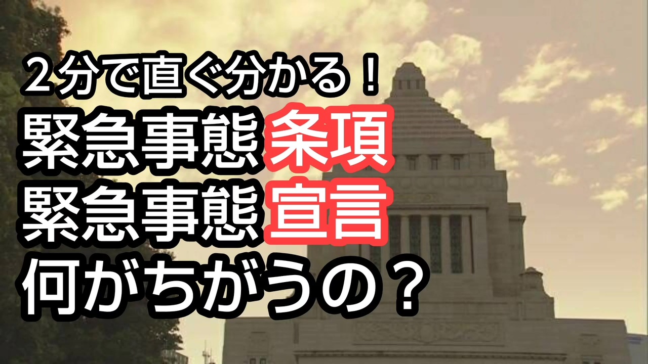 似ていてややこしい緊急事態"条項"と緊急事態"宣言" <br><br>名前が似ていても… 中身は全く違うんです…<br><br>約2分で誰でも分かるように解説動画を作成しました。<br><br><関連動画><br>ワク●ン拒否できる超重要憲法13条と97条が改憲で消え去る<br><a href="https://www.nicovideo.jp/watch/sm39745815" target="_blank" rel="noopener nofollow">https://www.nicovideo.jp/watch/sm39745815</a><br><br>【改憲】最高法規である97条削除でワク●ン義務化へ<br><a href="https://www.nicovideo.jp/watch/sm39822182" target="_blank" rel="noopener nofollow">https://www.nicovideo.jp/watch/sm39822182</a><br><br>「世界の敵」である日本が9条改正したらどうなるか?<br><a href="https://www.nicovideo.jp/watch/sm39947623" target="_blank" rel="noopener nofollow">https://www.nicovideo.jp/watch/sm39947623</a><br><br>反ワク●ン派に告ぐ、大きな罠に警戒せよ<br><a href="https://www.nicovideo.jp/watch/sm40053824" target="_blank" rel="noopener nofollow">https://www.nicovideo.jp/watch/sm40053824</a>