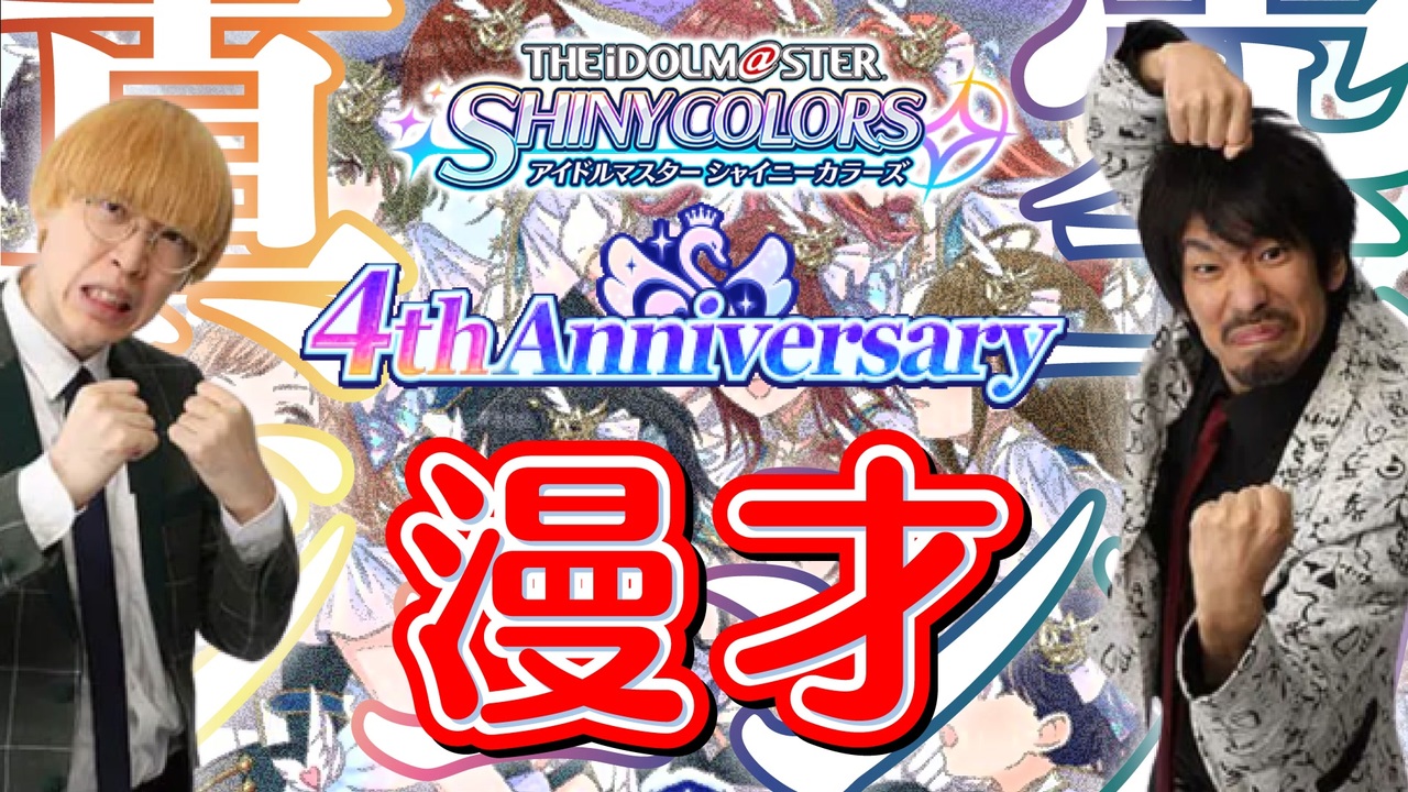 <span style="color: #4a86e8; font-size: 24px;"><strong>【シャニマス4周年】</strong></span><br><br><span style="color: #9900ff; font-size: 18px;"><strong>川北P「数年後、掘り起こすのを楽しみにしております。敬具」</strong></span><br><span style="color: #ff9900; font-size: 18px;"><strong>ガクP「あっ……これは『拝啓タイムカプセル』の結びの一文ですね」</strong></span><br><br><span style="color: #999999; font-size: 24px;"><strong>【真</strong></span><span style="color: #4a86e8; font-size: 24px;"><strong>空</strong></span><span style="color: #999999; font-size: 24px;"><strong>ジェシカ】</strong></span><br><br><span style="color: #4a86e8; font-size: 24px;"><i>THE IDOL M@STER SHINY COLORS 4th Anniversary</i></span><br><br>何度でもご無沙汰しております。紫緑です。<br><br>今回は、シャニマスの4周年ということで、昨年M1グランプリ決勝出場の<br>新世代コンビ・<span style="color: #666666;"><strong>真</strong></span><span style="color: #4a86e8;"><strong>空</strong></span><span style="color: #666666;"><strong>ジェシカ</strong></span>のお二人に挑戦いたしました。<br><br>少しでも笑っていただいて、<br>みなさまのシャニマスの思い出の末席に加えていただければ幸いです。<br><br>~日記~<br><br><span style="color: #262626;"><strong>4th LIVE、最高でした。</strong></span><br><br>ありがとう。おめでとう。<br>そして、これからも!<br><br>2022/11/30追記<br><span style="color: #ff0000;">祝・M1グランプリ2022決勝進出!</span><br><br>前 → <a href="https://www.nicovideo.jp/watch/sm39353451" class="watch">sm39353451</a><br>次 → <a href="https://www.nicovideo.jp/watch/sm40794091" class="watch">sm40794091</a><br /><span style="color: #000000; font-size: 14px;">※ この動画は実在のお笑い芸人さんのネタのパロディおよび物真似です。ご了承ください。</span><br><br><strong>これまでのお笑いm@ster</strong>:<a href="https://www.nicovideo.jp/mylist/67741577" target="_blank" rel="noopener">mylist/67741577</a><br><strong>Twitter</strong>:<a href="https://twitter.com/enishi910" target="_blank" rel="noopener nofollow">https://twitter.com/enishi910</a>