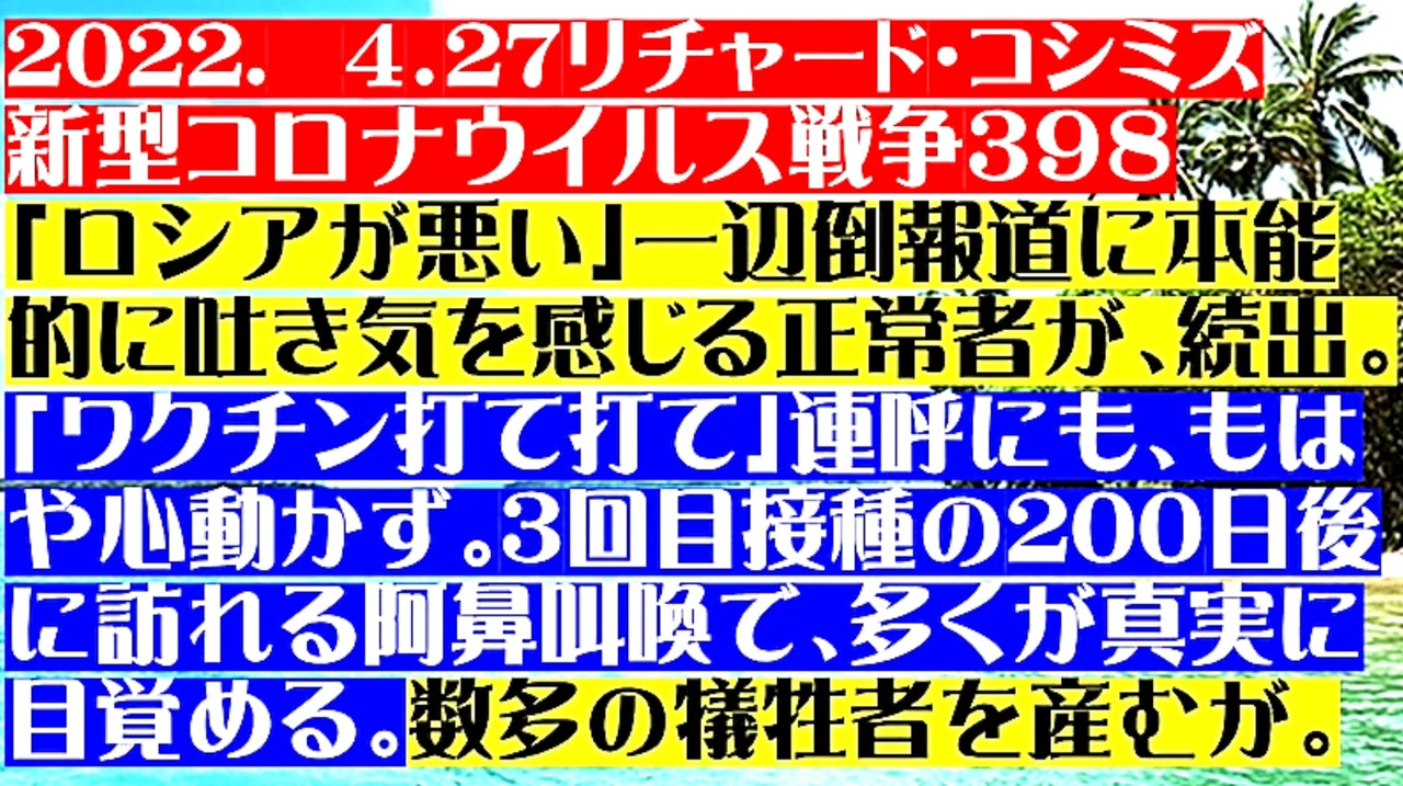 <span style="color: #cc4125;"><strong>【 テーマ:新型コロナウイルス戦争 398 】</strong></span><br><br><span style="color: #ff0000;"><strong>「『 ロシアが悪い 』一辺倒報道に、本能的に吐き気を感じる正常者が続出。<br> 『 ワクチン打て!打て!』連呼にも、もはや心動かず。<br> 3回目接種の200日後に訪れる阿鼻叫喚で、多くが真実に目覚める。数多の犠牲者を産むが 」</strong></span><br><br><span style="color: #38761d;">◆</span><span style="color: #38761d;"><strong>リチャード・コシミズ 公式 ブログ</strong></span><br> <a href="https://ameblo.jp/richardneversurrender/" target="_blank" rel="noopener nofollow">https://ameblo.jp/richardneversurrender/</a><br><br><span style="color: #38761d;">◆</span><span style="color: #38761d;"><strong>リチャード・コシミズ 公式 ホームページ</strong></span><br> <a href="http://richardkoshimizu.boo.jp/" target="_blank" rel="noopener nofollow">http://richardkoshimizu.boo.jp/</a><br><br><span style="color: #38761d;">◆</span><span style="color: #38761d;"><strong>リチャード・コシミズ 講演会 公式 動画ギャラリー</strong></span><br> <a href="http://www.t-sskk.com/richardkoshimizu/video-gallery/index.html" target="_blank" rel="noopener nofollow">http://www.t-sskk.com/richardkoshimizu/video-gallery/index.html</a><br>