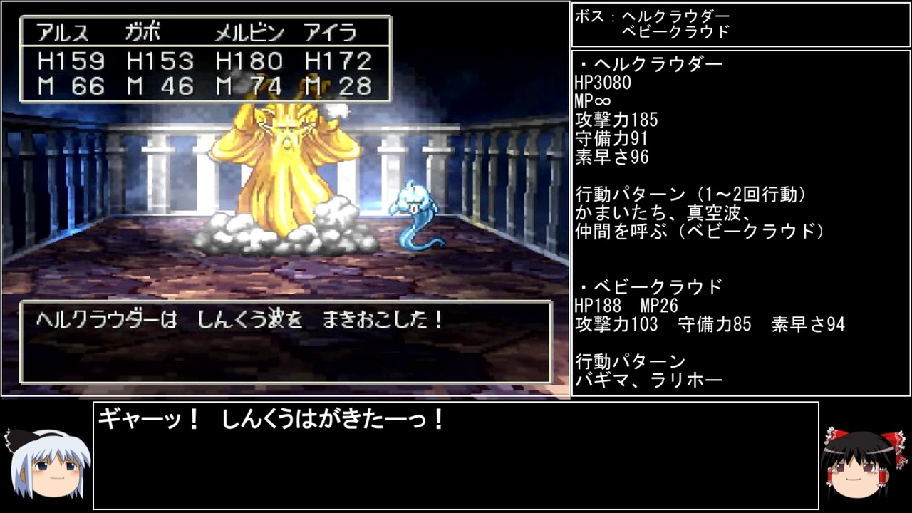大辞典のガバを見つけたり、詰み注意ポイントを紹介したり。<br>そしてみんなのトラウマボスですが、自分の初プレイ時はアルス魔法戦士、ガボ海賊だったので大苦戦でした。<br><br>前→<a href="https://www.nicovideo.jp/watch/sm40356337" class="watch">sm40356337</a> 次→<a href="https://www.nicovideo.jp/watch/sm40428099" class="watch">sm40428099</a><br><br>YouTube版→<a href="https://youtu.be/BarLptddHfY" target="_blank" rel="noopener nofollow">https://youtu.be/BarLptddHfY</a><br><br><br>※動画の大きさが変わる方は、お手数ですが設定→画質を自動から〇pに変えると解決します。<br>※一部機種は互換機を使用してのプレイとなります。<br><br>縛りルール(不明点はシリーズのQ&Aを参照)<br>①使った武器・防具・装飾品・道具・呪文・特技・一部特殊施設(メダル王・カジノ・移民の町)・職業(3,6,7)・仲間モンスター(4,5,6,8+7の職業)は次以降のシリーズで使用禁止。<br>(NPCキャラが使用した装備や呪文を含む。売却及び錬金素材としても使用扱い)<br><br>②裏技・バグ技の禁止。<br><br>③逃走禁止&戦闘終了時は全員生存。<br><br>④レベルを上げ過ぎない。<br>ダンジョンやボスは公式ガイドブックに記載されたレベル+3まで。<br>ラスボスは全ての呪文を習得するレベル+3程度までに収める。<br><br>⑤裏ボスも規定回数、規定ターン以内に倒す。<br>(6の裏ダンジョン突入時のみ、条件を満たすため①の職業を解禁)<br><br>(おまけ)<br>宝は可能なものに限り全回収。<br>5と6は同一モンスターの仲間不可。<br>回避可能なボスも全て倒す。<br><br><br>この動画で利用している株式会社スクウェア・エニックスを代表とする共同著作者が権利を所有する著作物及びスギヤマ工房有限会社が権利を所有する楽曲の転載・配布は禁止いたします。<br>(C) ARMOR PROJECT/BIRD STUDIO/SQUARE ENIX All Rights Reserved.<br>(C) SUGIYAMA KOBO (P) SUGIYAMA KOBO<br><br>AquesTalk2ライセンスID:AQTK2WINUSR23122185<br /><br><br>❤いいねを押していただけるとモチベーションと投稿速度が上がるので宜しくお願い致します!<br><br>作者ツイッター→ <a href="https://twitter.com/nig0117" target="_blank" rel="noopener nofollow">https://twitter.com/nig0117</a><br>PIXIV FANBOX→ <a href="https://sutanokeiji.fanbox.cc/" target="_blank" rel="noopener nofollow">https://sutanokeiji.fanbox.cc/</a><br><br>( 以前はWEB小説書いてました→ <a href="https://kakuyomu.jp/works/1177354054884910267" target="_blank" rel="noopener nofollow">https://kakuyomu.jp/works/1177354054884910267</a> )