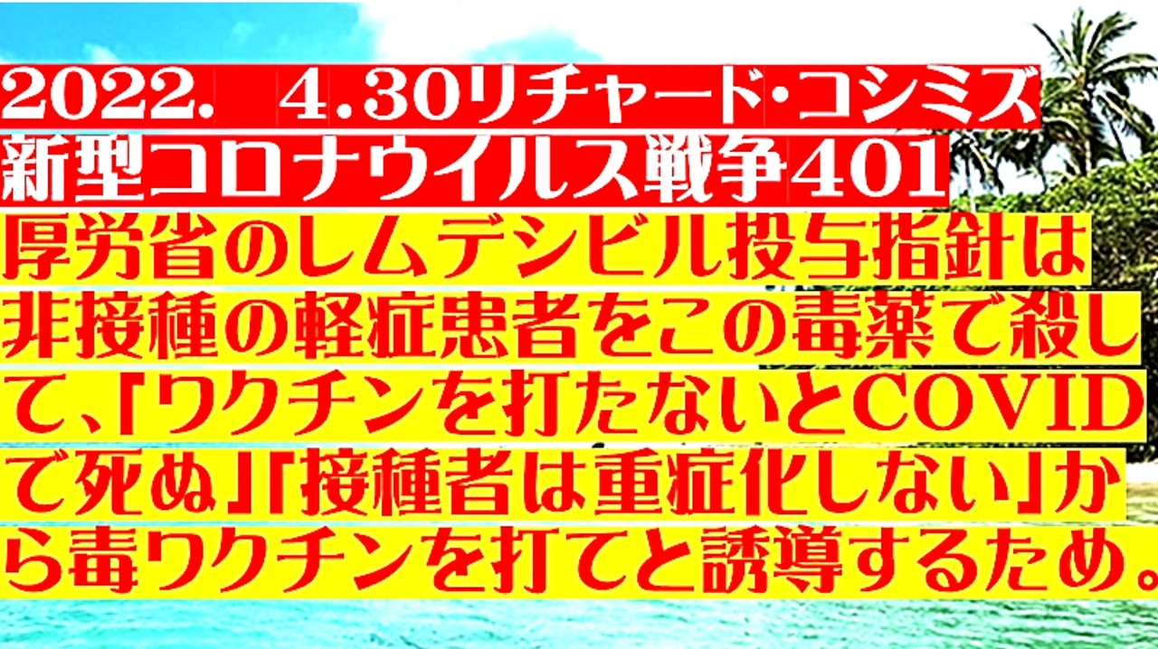 <span style="color: #cc4125;"><strong>【 テーマ:新型コロナウイルス戦争 401 】</strong></span><br><br><span style="color: #ff0000;"><strong>「厚生労働省の『レムデシビル』投与指針は、ワクチン非接種の軽症患者をこの毒薬で殺して、<br> 『ワクチンを打たないとCOVIDで死ぬ』・『ワクチン接種者は重症化しない』から毒ワクチン<br> を打てと、誘導するため」</strong></span><br><br><span style="color: #38761d;">◆</span><span style="color: #38761d;"><strong>リチャード・コシミズ 公式 ブログ</strong></span><br> <a href="https://ameblo.jp/richardneversurrender/" target="_blank" rel="noopener nofollow">https://ameblo.jp/richardneversurrender/</a><br><br><span style="color: #38761d;">◆</span><span style="color: #38761d;"><strong>リチャード・コシミズ 公式 ホームページ</strong></span><br> <a href="http://richardkoshimizu.boo.jp/" target="_blank" rel="noopener nofollow">http://richardkoshimizu.boo.jp/</a><br><br><span style="color: #38761d;">◆</span><span style="color: #38761d;"><strong>リチャード・コシミズ 講演会 公式 動画ギャラリー</strong></span><br> <a href="http://www.t-sskk.com/richardkoshimizu/video-gallery/index.html" target="_blank" rel="noopener nofollow">http://www.t-sskk.com/richardkoshimizu/video-gallery/index.html</a><br>