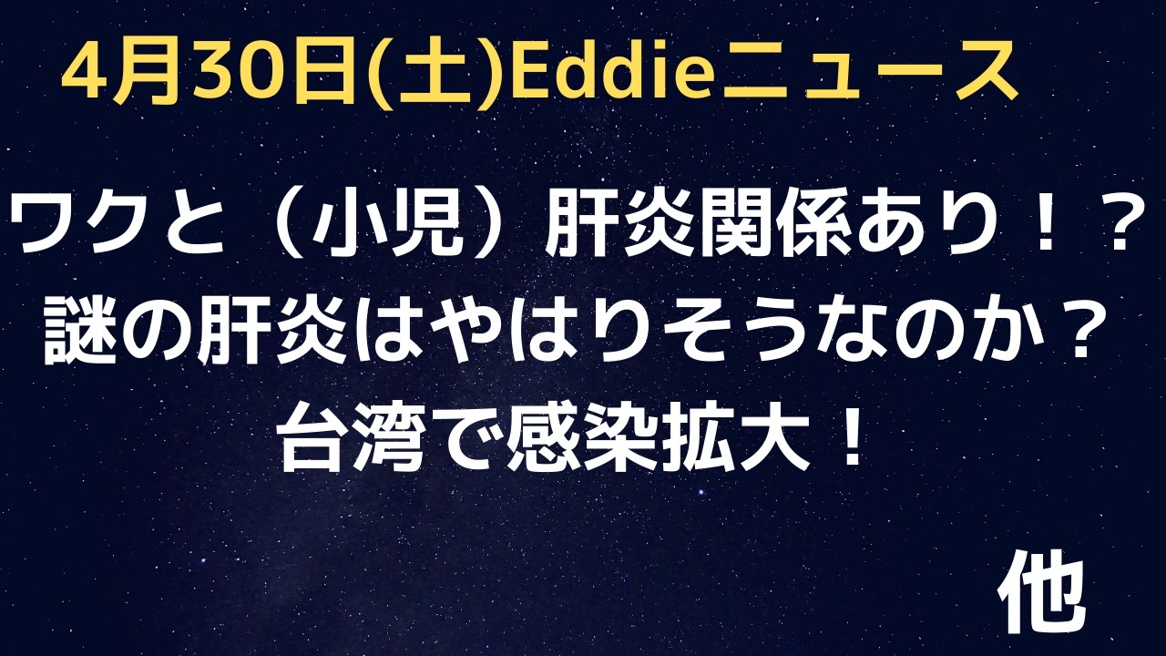 参考URL<br>台湾のアウトブレイク<br><a href="https://apnews.com/article/covid-business-health-asia-taiwan-f46f2cff5593fcbbc0ce9923b0e62fe8" target="_blank" rel="noopener nofollow">https://apnews.com/article/covid-business-health-asia-taiwan-f46f2cff5593fcbbc0ce9923b0e62fe8</a><br><br>肝炎とワクチンの関連性の研究登場<br><a href="https://dailyexpose.uk/2022/04/28/new-study-confirms-covid-jab-causes-hepatitis-kids/" target="_blank" rel="noopener nofollow">https://dailyexpose.uk/2022/04/28/new-study-confirms-covid-jab-causes-hepatitis-kids/</a><br><br><br />Eddieと申します。<br>少し引棒めいたニュースを集めて喋っています。<br>よろしくお願いします。<br><br>23時過ぎYouTubeライブ配信(マイペース配信中)<br>「Eddieのホンマやと思うニュース3」<br><a href="https://www.youtube.com/channel/UCKaftD6X-qeHC5Vd9CMCedw" target="_blank" rel="noopener nofollow">https://www.youtube.com/channel/UCKaftD6X-qeHC5Vd9CMCedw</a><br><br>ニコ生は毎週土曜21時半〜(もしくは日曜21時半〜)<br><br>twitter<br>@Eddie2travel<br><br>YouTubeライブ配信1000回記念グッズなど販売中<br><a href="https://suzuri.jp/Eddie-Homma3" target="_blank" rel="noopener nofollow">https://suzuri.jp/Eddie-Homma3</a><br><br>