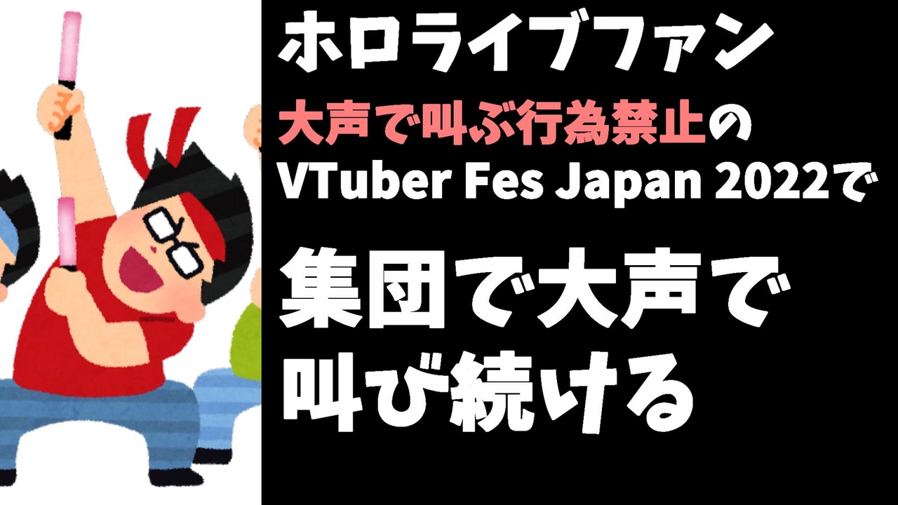 2022年4月29日と30日のVTuberFes2022において、観客は感染対策等により声を出さずに静かに見るよう注意を受けていたのですが、特にホロライブのファンとウマ娘のファンがずっと叫んでいたとして顰蹙を買っています。<br><br>引用<br>なし<br><br>今後の 製作予定動画<br>元にじさんじ運営幹部いわなが社長、新しい箱を立ち上げる<br>にじさんじ×DLsite ASMRコラボ5~6弾販売中止<br>【悲報】鳴神裁「裁判をすっ飛ばして逮捕はあり得ない」<br>にじさんじ引退者まとめPart.3<br>にじさんじとストーカー被害まとめ<br>【悲報】にじさんじライバー、一本満足バーを一度に二本食べてしまう<br><br>公開マイリスト<br>1 <a href="https://www.nicovideo.jp/mylist/66855587" target="_blank" rel="noopener nofollow">https://www.nicovideo.jp/mylist/66855587</a><br>2 <a href="https://www.nicovideo.jp/mylist/71980663" target="_blank" rel="noopener nofollow">https://www.nicovideo.jp/mylist/71980663</a><br>Youtube <a href="https://www.youtube.com/channel/UCzYQPx8MeE99DUkW9Y_txJw" target="_blank" rel="noopener nofollow">https://www.youtube.com/channel/UCzYQPx8MeE99DUkW9Y_txJw</a><br>twitter <a href="https://twitter.com/V_Virgin_Mary" target="_blank" rel="noopener nofollow">https://twitter.com/V_Virgin_Mary</a><br><br>使用素材<br>高品質なフリー動画素材 - Pixabay <a href="https://pixabay.com/ja/videos" target="_blank" rel="noopener nofollow">https://pixabay.com/ja/videos</a><br>いらすとや様 <a href="https://www.irasutoya.com/" target="_blank" rel="noopener nofollow">https://www.irasutoya.com/</a>