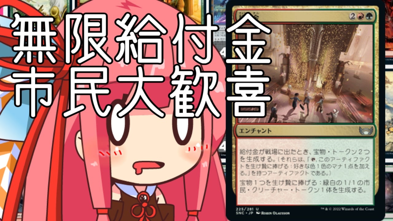 ドラフト勝てないので初投稿です。<br>クソデッカーです。<br><br>BGM:shiso<br> 錬金術師の錆びた釜<br><br>マイリスト:<a href="https://www.nicovideo.jp/mylist/70716776" target="_blank" rel="noopener">mylist/70716776</a><br>前回:<a href="https://www.nicovideo.jp/watch/sm40392106" class="watch">sm40392106</a><br>次回:<a href="https://www.nicovideo.jp/watch/sm40423611" class="watch">sm40423611</a><br><br>Twitter:@siki_sikigamin<br>(クソデッカー茜ちゃんでよくエゴサしてます。)<br><br>デッキ<br>2 タミヨウの保管 (NEO) 211<br>4 厚顔の無法者、マグダ (KHM) 142<br>4 裕福な亭主 (AFR) 200<br>4 勢団の銀行破り (NEO) 255<br>4 ゾーン (AFR) 167<br>2 鏡割りの寓話 (NEO) 141<br>1 機知ある怨怒取り (SNC) 131<br>3 大勝ち (SNC) 102<br>1 玄武岩の荒廃者 (KHM) 122<br>4 給付金 (SNC) 225<br>4 仮面林の結節点 (KHM) 240<br>3 収穫祭の襲撃 (MID) 200<br>5 山 (SNC) 269<br>6 森 (SNC) 271<br>2 反逆のるつぼ、霜剣山 (NEO) 276<br>1 バグベアの居住地 (AFR) 254<br>1 耐え抜くもの、母聖樹 (NEO) 266<br>1 ハイドラの巣 (AFR) 259<br>4 岩山被りの小道 (ZNR) 261<br>4 落石の谷間 (MID) 266