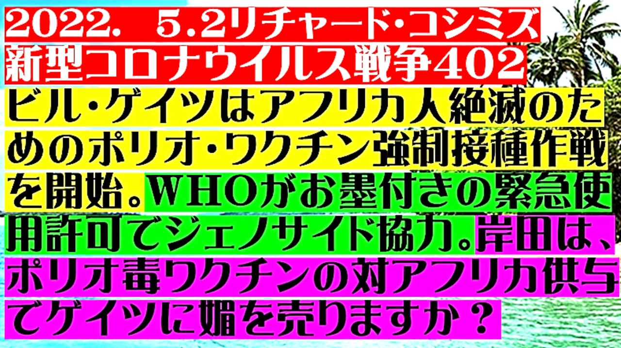<span style="color: #cc4125;"><strong>【 テーマ:新型コロナウイルス戦争 402 】</strong></span><br><br><span style="color: #ff0000;"><strong>「 ビル・ゲイツは、アフリカ人絶滅のための『 ポリオ・ワクチン 』強制接種作戦を開始。<br> WHOが、お墨付きの緊急使用許可でジェノサイド協力。<br> 岸田文雄は、『 ポリオ毒ワクチン 』の対アフリカ供与で、ビル・ゲイツに媚を売りますか? 」</strong></span><br><br><span style="color: #cc4125;"><strong>◆【2022年05月03日:リチャード・コシミズ Internet 講演】<br> 「テーマ:新型コロナウイルス戦争 403」はこちらです。</strong></span><br> <a href="https://rumble.com/v13bb63-2022.5.3.html" target="_blank" rel="noopener nofollow">https://rumble.com/v13bb63-2022.5.3.html</a><br><br>◆<span style="color: #262626;"><strong>WF2007年1月リチャード・コシミズ講演「ヒットラーはユダヤ人だった」・「ヒットラーは南米に<br> 逃れて最近まで生きていた!」</strong></span><br> <a href="https://www.veoh.com/watch/v160716439hwGwtq4" target="_blank" rel="noopener nofollow">https://www.veoh.com/watch/v160716439hwGwtq4</a><br><br><span style="color: #38761d;">◆</span><span style="color: #38761d;"><strong>リチャード・コシミズ 公式 ブログ</strong></span><br> <a href="https://ameblo.jp/richardneversurrender/" target="_blank" rel="noopener nofollow">https://ameblo.jp/richardneversurrender/</a><br><br><span style="color: #38761d;">◆</span><span style="color: #38761d;"><strong>リチャード・コシミズ 公式 ホームページ</strong></span><br> <a href="http://richardkoshimizu.boo.jp/" target="_blank" rel="noopener nofollow">http://richardkoshimizu.boo.jp/</a><br><br><span style="color: #38761d;">◆</span><span style="color: #38761d;"><strong>リチャード・コシミズ 講演会 公式 動画ギャラリー</strong></span><br> <a href="http://www.t-sskk.com/richardkoshimizu/video-gallery/index.html" target="_blank" rel="noopener nofollow">http://www.t-sskk.com/richardkoshimizu/video-gallery/index.html</a><br>