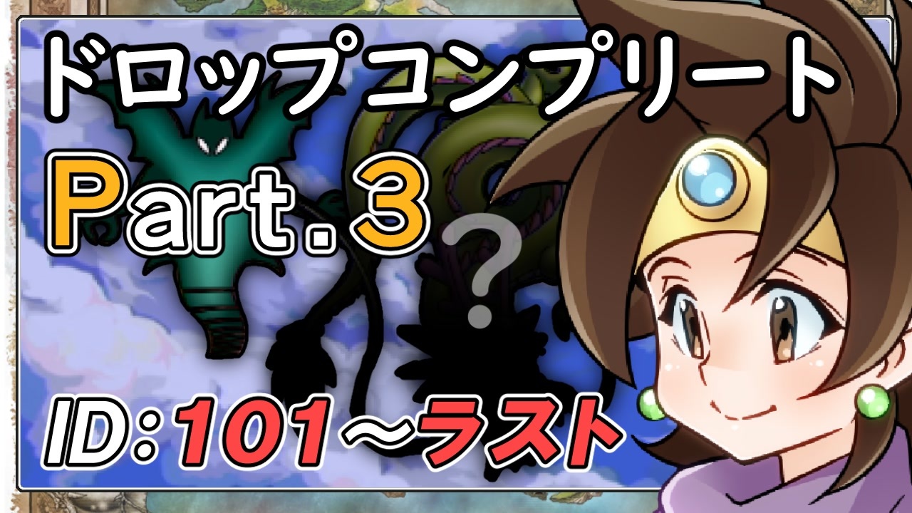 NintendoSwitch版ドラゴンクエスト3で全モンスターのドロップアイテムを集めるプレイをしました。<br>今回はID:101~ラストまでのモンスターです。<br>この動画には最終ボスやクリア後の世界に関するネタバレが含まれているのでご注意ください。<br>参考サイト:GCGX様 <a href="https://gcgx.games/" target="_blank" rel="noopener nofollow">https://gcgx.games/</a><br><br>Part1:<a href="https://www.nicovideo.jp/watch/sm40119866" class="watch">sm40119866</a> Part2:<a href="https://www.nicovideo.jp/watch/sm40189115" class="watch">sm40189115</a> Part3:ここ<br>ドラクエ3マイリス:<a href="https://www.nicovideo.jp/mylist/72811964" target="_blank" rel="noopener">mylist/72811964</a><br>プレイ目標<br>・全モンスターの落とした宝箱の中身を確認<br>・盗賊による盗みは対象外<br><br>パート1集マイリス:<a href="https://www.nicovideo.jp/mylist/51294090" target="_blank" rel="noopener">mylist/51294090</a><br><br>この動画で利用している株式会社スクウェア・エニックスを代表とする<br>共同著作者が権利を所有する著作物及び<br>スギヤマ工房有限会社が権利を所有する楽曲の転載・配布は禁止いたします。<br>(C)1988,2019 ARMOR PROJECT/BIRD STUDIO/SPIKE CHUNSOFT/SQUARE ENIX All Rights Reserved.<br>(C)SUGIYAMA KOBO