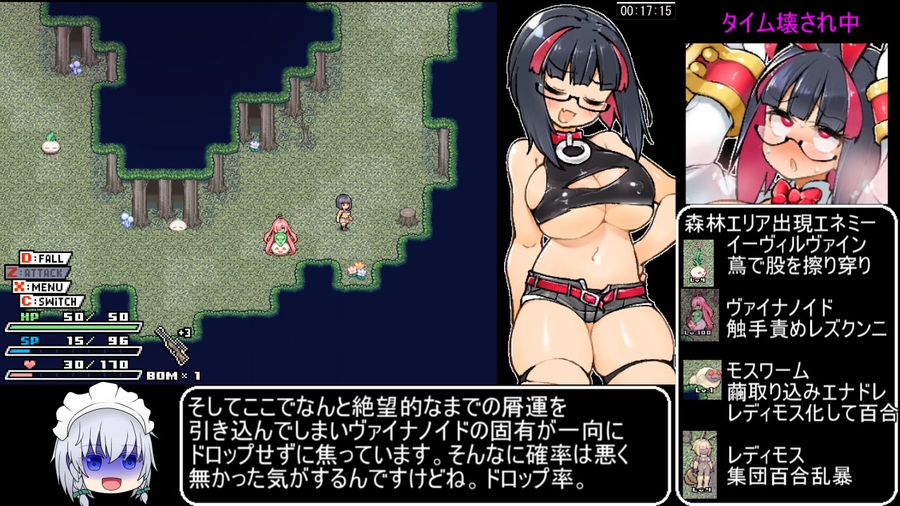 マップを自作して右上枠で進行状況を動画にして表した事で<br>自由に喋る時間を多く取る事が出来ました。<br>後で見返した時にちゃんと自分で興奮出来る文章を書くための工夫という訳ですね。<br><br><strong>【私が一番かわいい】</strong>様制作のR-18アクションRPG<br><strong>【リジネッタさんの冒険】</strong>RTAです。(ver1.20)<br>計測開始:New Game選択<br>計測終了:最後のアイテムを入手し、消費アイテム以外のアイテムをコンプリートした瞬間<br><br><br><strong>前→<a href="https://www.nicovideo.jp/watch/sm40404562" class="watch">sm40404562</a><br><br>リジネッタさんの冒険のマイリスト→ <a href="https://www.nicovideo.jp/mylist/73135503" target="_blank" rel="noopener">mylist/73135503</a><br><br>パート1と単発のマイリスト→<a href="https://www.nicovideo.jp/mylist/70659794" target="_blank" rel="noopener">mylist/70659794</a></strong><br><br>twitter:@hihidowser<br><br>スマホやタブレット等から見られない方はこちらの方の動画を参考にすると<br>見られるようになるはずです→ <strong><a href="https://www.nicovideo.jp/watch/sm38575952" class="watch">sm38575952</a></strong><br><br><span style="font-size: 16px;"><strong>本作品の購入は下記サイトにて!<br>作品:<a href="https://www.dlsite.com/maniax/work/=/product_id/RJ357197.html" target="_blank" rel="noopener nofollow">https://www.dlsite.com/maniax/work/=/product_id/RJ357197.html</a><br><br>Cien:<a href="https://ci-en.dlsite.com/creator/2161" target="_blank" rel="noopener nofollow">https://ci-en.dlsite.com/creator/2161</a><br><br>X(twitter):<a href="https://x.com/super_mican" target="_blank" rel="noopener nofollow">https://x.com/super_mican</a><br><br><br>私ヒヒダウザーこと【ヒヒカネ工房】の作品などはこちら!<br>作品:<a href="https://www.dlsite.com/maniax/work/=/product_id/RJ01236961.html" target="_blank" rel="noopener nofollow">https://www.dlsite.com/maniax/work/=/product_id/RJ01236961.html</a><br><br>Cien:<a href="https://ci-en.dlsite.com/creator/21024" target="_blank" rel="noopener nofollow">https://ci-en.dlsite.com/creator/21024</a><br><br>X(twitter):<a href="https://twitter.com/hihidowser" target="_blank" rel="noopener nofollow">https://twitter.com/hihidowser</a><br><br>misskey:<a href="https://misskey.io/@hihidowser" target="_blank" rel="noopener nofollow">https://misskey.io/@hihidowser</a></strong></span><br><br><br>