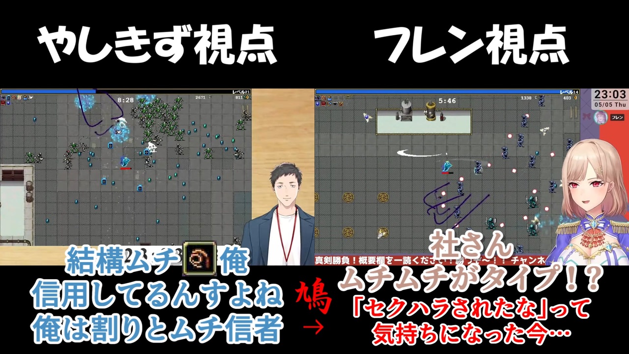 とんでもないアンジャッシュ起きてる!<br>それにこの流れ数年前にも見た記憶が…<br><br>本家参考動画<br>・社築<br>【Vampire Survivors】弱キャラでクリアタイム対決!!フレンには負けられねぇ【にじさんじ/社築】<br><a href="https://youtu.be/ikPdRtWjfvg" target="_blank" rel="noopener nofollow">https://youtu.be/ikPdRtWjfvg</a><br>・フレン・E・ルスタリオ<br>【Vampire Survivors】最弱キャラで先にクリアしたら勝ち!vs社さん【にじさんじ】<br><a href="https://youtu.be/PDrVH7yi3OE" target="_blank" rel="noopener nofollow">https://youtu.be/PDrVH7yi3OE</a><br><br>参考元チャンネル&Twitter<br>・社築<br><a href="https://www.youtube.com/channel/UCKMYISTJAQ8xTplUPHiABlA" target="_blank" rel="noopener nofollow">https://www.youtube.com/channel/UCKMYISTJAQ8xTplUPHiABlA</a><br><a href="https://twitter.com/846kizuQ" target="_blank" rel="noopener nofollow">https://twitter.com/846kizuQ</a><br>・フレン・E・ルスタリオ<br><a href="https://www.youtube.com/channel/UCuep1JCrMvSxOGgGhBfJuYw" target="_blank" rel="noopener nofollow">https://www.youtube.com/channel/UCuep1JCrMvSxOGgGhBfJuYw</a><br><a href="https://twitter.com/furen_2434" target="_blank" rel="noopener nofollow">https://twitter.com/furen_2434</a><br><br>mine さん<br>mamerald さん<br>くろき さん<br>ハイソフト さん<br>hobby さん<br>ます さん<br>虚数 さん<br>チョコレートケーキ さん<br>Cocoa さん<br>Midwinter さん<br>ラズ@ さん<br>日替わり鍋 さん<br>焼きそば さん<br>鵺丸堂 さん フレンちゃんのムチムチ大冒険<br>ガルバーニ電竜 さん<br>クロン さん<br>37% さん<br>おっさんビッテン さん<br>ver1.21 さん<br>twinkle さん<br>サカヅキさん さん<br>硝子 さん<br>shadch さん<br>広告ありがとうございます<br><br>ニコニコのダイコンマンリスト<br>「バーチャルYouTuberシリーズ」↓<br><a href="https://www.nicovideo.jp/mylist/62551838" target="_blank" rel="noopener">mylist/62551838</a><br>「バーチャルYouTuberシリーズ2」↓<br><a href="https://www.nicovideo.jp/mylist/67858437" target="_blank" rel="noopener">mylist/67858437</a><br>「バーチャルYouTuberシリーズ3」↓<br><a href="https://www.nicovideo.jp/mylist/71340675" target="_blank" rel="noopener">mylist/71340675</a><br><br>ダイコンマンのTwitter<br><a href="https://twitter.com/Daikon_Man_V" target="_blank" rel="noopener nofollow">https://twitter.com/Daikon_Man_V</a>