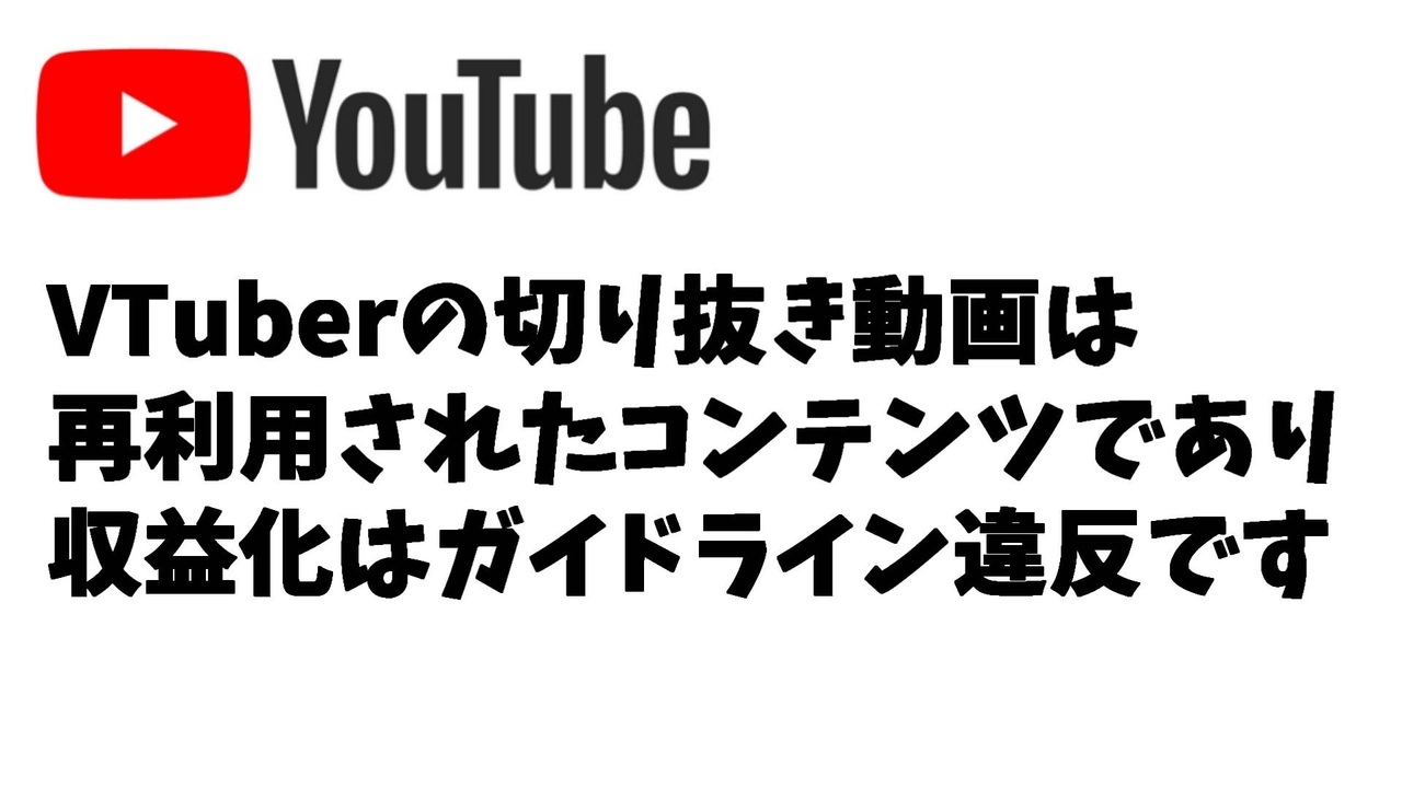 2022年4月以降、複数のホロライブ切り抜き動画制作者やぶいすぽの切り抜き動画制作者より、収益化が停止されたとの報告が相次いでいます。停止の理由としてYouTubeから連絡があったのは「再利用されたコンテンツ」・・・。VTuber界隈以外の切り抜き動画でも収益化停止報告が多く、今後はYouTubeで切り抜き動画によって収益を上げるのが難しくなる、または常に収益化停止のリスクが付きまとうことになるでしょう。<br><br>引用<br><a href="https://twitter.com/Xhm6g2fe27YoMj8/status/1524705527955353600" target="_blank" rel="noopener nofollow">https://twitter.com/Xhm6g2fe27YoMj8/status/1524705527955353600</a><br><br>今後の 製作予定動画<br>元にじさんじ運営幹部いわなが社長、新しい箱を立ち上げる<br>にじさんじ×DLsite ASMRコラボ5~6弾販売中止<br>【悲報】鳴神裁「裁判をすっ飛ばして逮捕はあり得ない」<br>にじさんじ引退者まとめPart.3<br>にじさんじとストーカー被害まとめ<br>【悲報】にじさんじライバー、一本満足バーを一度に二本食べてしまう<br><br>公開マイリスト<br>1 <a href="https://www.nicovideo.jp/mylist/66855587" target="_blank" rel="noopener nofollow">https://www.nicovideo.jp/mylist/66855587</a><br>2 <a href="https://www.nicovideo.jp/mylist/71980663" target="_blank" rel="noopener nofollow">https://www.nicovideo.jp/mylist/71980663</a><br>Youtube <a href="https://www.youtube.com/channel/UCzYQPx8MeE99DUkW9Y_txJw" target="_blank" rel="noopener nofollow">https://www.youtube.com/channel/UCzYQPx8MeE99DUkW9Y_txJw</a><br>twitter <a href="https://twitter.com/V_Virgin_Mary" target="_blank" rel="noopener nofollow">https://twitter.com/V_Virgin_Mary</a><br><br>使用素材<br>高品質なフリー動画素材 - Pixabay <a href="https://pixabay.com/ja/videos" target="_blank" rel="noopener nofollow">https://pixabay.com/ja/videos</a><br>いらすとや様 <a href="https://www.irasutoya.com/" target="_blank" rel="noopener nofollow">https://www.irasutoya.com/</a>