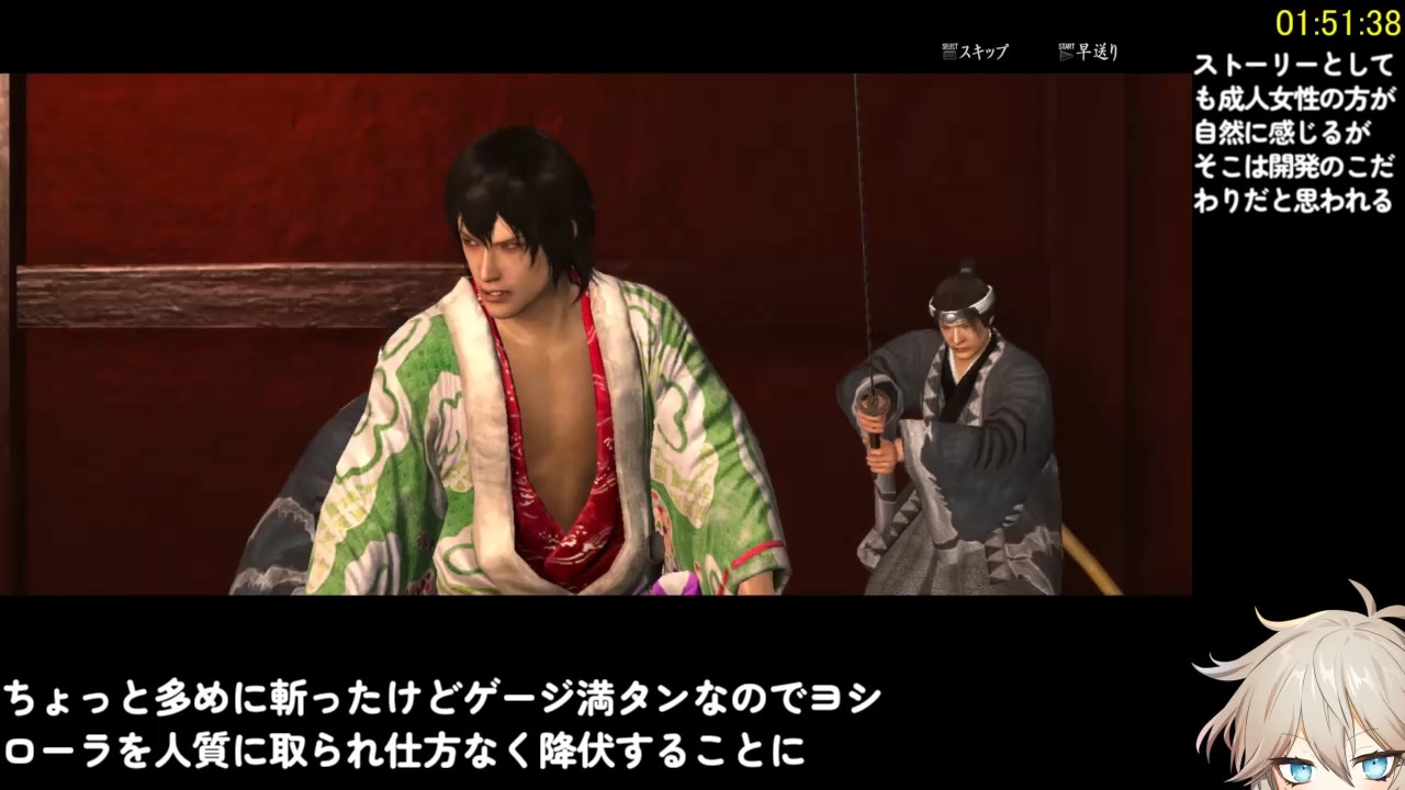 イベント解説が多く喋りっぱなしなので初投稿です。<br>前→<a href="https://www.nicovideo.jp/watch/sm40436582" class="watch">sm40436582</a><br>次→<a href="https://www.nicovideo.jp/watch/sm40497837" class="watch">sm40497837</a><br><br>レギュレーション<br>1.計測開始は「はじめから」を押した瞬間<br>2.計測終了は「完」が表示された瞬間<br>3.以下のDLCを導入済み(侍道4plusと同一)<br>「坂本龍馬」「新撰組セット」「あの人は今……セット」<br>4.日本語化済み<br><br>Way of the Samurai 4(侍道4)<br><a href="https://store.steampowered.com/app/312780/Way_of_the_Samurai_4/?l=japanese" target="_blank" rel="noopener nofollow">https://store.steampowered.com/app/312780/Way_of_the_Samurai_4/?l=japanese</a><br>----------------------<br>音声作成、読み上げ:VOICEVOX<br>使用音声:春日部つむぎ<br>立ち絵:春日部つむぎ立ち絵素材(公式)<br>編集ソフト:AviUtl<br>----------------------<br>2022/5/21 13:50追記<br>春巻 さん、団子 さん、hirohiro2929 さん、出落ち二等兵 さん、モロダシ・ダン さん、富井副部長 さん、ぬちゃぬちゃ さん、ゲスト さん、Yadokari さん、ワガハイ さん、ゴハン さん、IFP さん、ダイス さん、ムーニン さん、hiro.2 さん、米男 さん、ルチアーノ さん、キョージュ さん、司馬慶 さん、ロースとビーフ さん、井之頭五郎 さん、JJ10 さん<br><br>広告アリちゃんです!記載が遅くなってごめんね!