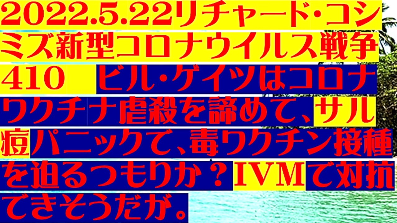 <span style="color: #cc4125;"><strong>「 テーマ:新型コロナウイルス戦争 410」</strong></span><br><br><span style="color: #ff0000;"><strong>「 ビル・ゲイツはコロナワクチン虐殺を諦めて、『サル痘パニック』で、毒ワクチン接種を迫るつもりか?<br> 『 IVM( イベルメクチン )』で対抗できそうだが 」</strong></span><br><br><span style="color: #0000ff;"><strong>*( 訂正 ): タイトル画面のところで「 IVM( イベルメクチン )」を「 レムデシベル 」と読み間違え。<br> 訂正してお詫び。</strong></span><br><br><span style="color: #262626;"><strong>*「フォロー」・「ニコニ広告」・「いいね!」・「情報拡散」等、ご協力下さい。 リチャード・コシミズ</strong></span><br><br> ◆最早、「コロナ・毒ワクチンの接種強要」は通用しない。ビル・ゲイツの「人類9割淘汰計画」は、<br> 暗礁に乗り上げた!<br><br> ◆ビル・ゲイツ&WHOは、「狂犬病・マールブルグ病・鳥インフルH5N1」を「コロナの次」に準備<br> していたと思われる。だが、ウクライナの生物兵器開発拠点をプーチン氏に潰された。<br> 結果、現状で使える兵器は、「サル痘」?<br><br><span style="color: #38761d;">◆</span><span style="color: #38761d;"><strong>リチャード・コシミズ 公式 ブログ</strong></span><br> <a href="https://ameblo.jp/richardneversurrender/" target="_blank" rel="noopener nofollow">https://ameblo.jp/richardneversurrender/</a><br><br><span style="color: #38761d;">◆</span><span style="color: #38761d;"><strong>リチャード・コシミズ 公式 ホームページ<br> </strong></span><a href="http://richardkoshimizu.boo.jp/" target="_blank" rel="noopener nofollow">http://richardkoshimizu.boo.jp/</a><br><br><span style="color: #38761d;">◆</span><span style="color: #38761d;"><strong>リチャード・コシミズ 講演会 公式 動画ギャラリー</strong></span><br> <a href="http://www.t-sskk.com/richardkoshimizu/video-gallery/index.html" target="_blank" rel="noopener nofollow">http://www.t-sskk.com/richardkoshimizu/video-gallery/index.html</a><br>