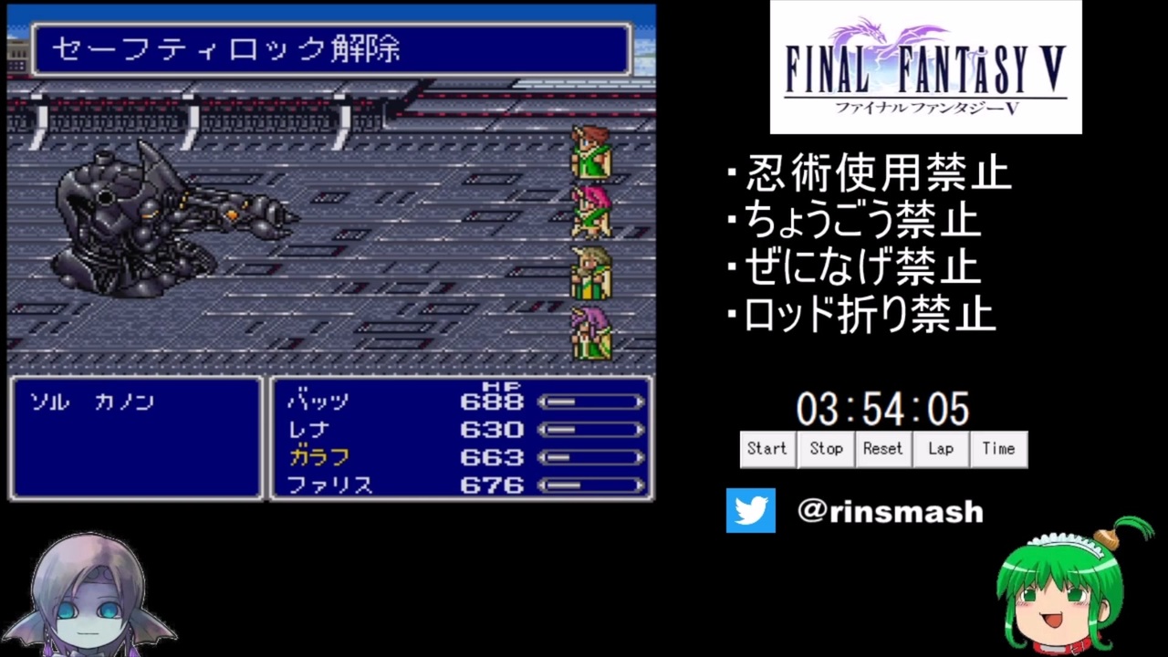 <a href="https://www.nicovideo.jp/watch/sm40490696" class="watch">sm40490696</a>←前 <a href="https://www.nicovideo.jp/mylist/73193456" target="_blank" rel="noopener">mylist/73193456</a> 次→<a href="https://www.nicovideo.jp/watch/sm40519855" class="watch">sm40519855</a><br><a href="https://www.nicovideo.jp/series/322107" target="_blank" rel="noopener nofollow">https://www.nicovideo.jp/series/322107</a><br><br>・忍術使用禁止<br>・ちょうごう禁止<br>・ぜになげ禁止<br>・ロッド折り禁止<br><br>録画元は自分のニコニコ生放送です<br><br>プレイ環境<br>WiiU VC版 SFC FF5<br><br>You Tube版<br><a href="https://youtu.be/3zAmlUieCjk" target="_blank" rel="noopener nofollow">https://youtu.be/3zAmlUieCjk</a><br><br>他の投稿動画シリーズ(一部)<br>【完全ノータンク縛り】メトロイドプライムハードモード <a href="https://www.nicovideo.jp/user/652845/series/500012" target="_blank" rel="noopener nofollow">https://www.nicovideo.jp/user/652845/series/500012</a><br>迫真ガバガバ将棋部 <a href="https://www.nicovideo.jp/series/231191" target="_blank" rel="noopener nofollow">https://www.nicovideo.jp/series/231191</a><br>メトロイドドレッドRTA <a href="https://www.nicovideo.jp/series/288461" target="_blank" rel="noopener nofollow">https://www.nicovideo.jp/series/288461</a><br>STGとか <a href="https://www.nicovideo.jp/series/232145" target="_blank" rel="noopener nofollow">https://www.nicovideo.jp/series/232145</a><br><br>きくたん兄貴、White_Cat兄貴、なちょ兄貴、れうすき兄貴、ねねこ・こねねこ兄貴、hirohiro2929兄貴、ねっぷう兄貴、mulmul兄貴、oganinja兄貴、苦紗弥兄貴、Piko兄貴、かーくん兄貴、かなぎ兄貴、萌葱色兄貴、せいどん兄貴、<a href="https://www.nicovideo.jp/watch/sm13869948" class="watch">sm13869948</a>兄貴、Noir兄貴、春巻兄貴、Lui兄貴、GGG兄貴、広告ありがとナス!