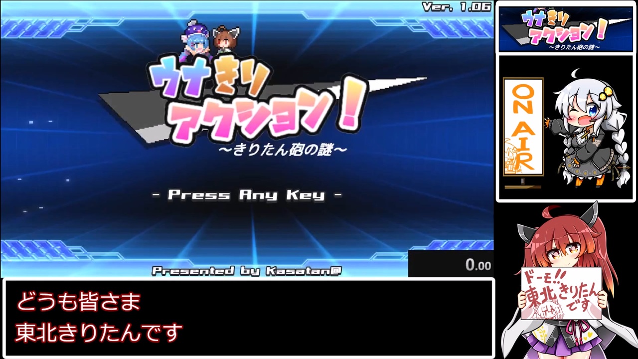 別レギュを走ったのは初めてなので初投稿です。<br><br>【走ったゲーム】<br>ウナきりアクション! -きりたん砲の謎-<br><br>プレイはこちら<strong>(無料)</strong><br><a href="https://unityroom.com/games/unakiriaction" target="_blank" rel="noopener nofollow">https://unityroom.com/games/unakiriaction</a><br><br>【RTA先駆者様】<br><a href="https://www.nicovideo.jp/watch/sm38006359" class="watch">sm38006359</a><br><a href="https://www.nicovideo.jp/watch/sm37934904" class="watch">sm37934904</a><br><br>【ウナきりアクション実況動画】<br>【ウナきり実況】ウナきりアクション!をウナきりが実況プレイ!<br><a href="https://www.nicovideo.jp/watch/sm40425120" class="watch">sm40425120</a><br><br>紲星あかり VS 紲星あかり VS ダークライ「ウナきりアクション! -きりたん砲の謎-」【ボイスロイド実況】①<br><a href="https://www.nicovideo.jp/watch/sm40471888" class="watch">sm40471888</a><br><br>【使用ツール】<br>ゆっくりムービーメーカー4<br>A.I.VOICE 紲星あかり<br>VOICEROID+ 東北きりたん<br>VOICEROID2 東北イタコ<br>VOICEROID2音街ウナ<br>CeVIO AI さとうささら<br>VoiceroidUtil<br>ニコ動宣伝者リストアップ<br><br>【お借りした素材】<br>・りんどう様<br>紲星あかり:<a href="https://seiga.nicovideo.jp/seiga/im9689364" target="_blank" rel="noopener">im9689364</a><br>東北きりたん:<a href="https://seiga.nicovideo.jp/seiga/im10261811" target="_blank" rel="noopener">im10261811</a><br>ミニあかりん:<a href="https://seiga.nicovideo.jp/seiga/im10933838" target="_blank" rel="noopener">im10933838</a><br>さとうささら:<a href="https://seiga.nicovideo.jp/seiga/im10791869" target="_blank" rel="noopener">im10791869</a><br>ホイッスルあかりん:<a href="https://seiga.nicovideo.jp/seiga/im10568267" target="_blank" rel="noopener">im10568267</a><br>音街ウナ:<a href="https://seiga.nicovideo.jp/seiga/im9763333" target="_blank" rel="noopener">im9763333</a>