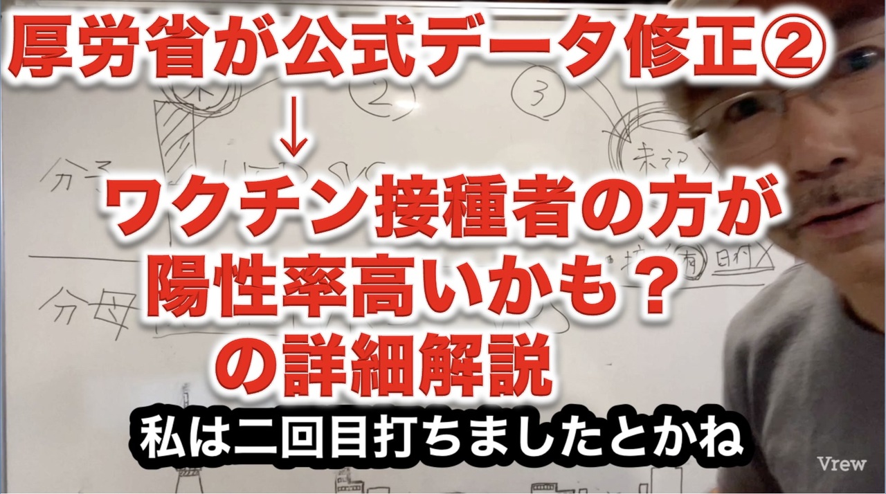 厚生労働省が5月11日付のアドバイザリーボードで修正した「ワクチン効果水増しデータ」解説の続編です。<br>データが「率」であることの詳細と、それによってわかる水増しの仕組み。また、実はまだ「ワクチン接種済み」の層の検査陽性率が低く計上されている可能性も?というところまでわかるように、詳しくかつ分かりやすく解説します。<br><br>繰り返しますが、すでに8割の国民が厚労省からのデータを信じ副作用のリスクを負ってまでワクチンを打ったわけで、この「有効性のデータ水増し」公表は本当に大変な事件です。この大事件に対してメディアが一斉に沈黙していることも本当に不思議。この国の閉塞感を如実に表現しているのではないかと思ってしまいます。<br><br>(PR)<br>ワクチンやコロナ禍に対する僕の思いはこの本にまとめましたので是非御覧ください。<br><br>書籍「人は家畜になっても生き残る道を選ぶのか? 」<br> ↓↓<br><a href="https://amzn.to/387Lxzf" target="_blank" rel="noopener nofollow">https://amzn.to/387Lxzf</a><br><br><br><br>データ出典:<br>○修正後データ<br> 厚労省アドバイザリーボード5/11 <a href="https://www.mhlw.go.jp/content/10900000/000937646.pdf" target="_blank" rel="noopener nofollow">https://www.mhlw.go.jp/content/10900000/000937646.pdf</a><br>○修正前データ <br> 厚労省アドバイザリーボード4/20 <a href="https://www.mhlw.go.jp/content/10900000/000931576.pdf" target="_blank" rel="noopener nofollow">https://www.mhlw.go.jp/content/10900000/000931576.pdf</a><br>○コロナ患者発生届の書式 <a href="https://www.mhlw.go.jp/content/000737647.pdf" target="_blank" rel="noopener nofollow">https://www.mhlw.go.jp/content/000737647.pdf</a><br>○ディオバン事件 <a href="https://www.med.or.jp/dl-med/doctor/member/kiso/h12.pdf" target="_blank" rel="noopener nofollow">https://www.med.or.jp/dl-med/doctor/member/kiso/h12.pdf</a><br><br><br><br><br><br><br /> <br> <br>YouTubeでBANされたのでニコ動に引っ越しました^^;