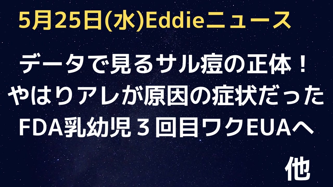 参考URL<br><a href="https://www.lifesitenews.com/news/belgium-mandates-21-day-quarantine-for-people-who-test-positive-for-monkeypox/" target="_blank" rel="noopener nofollow">https://www.lifesitenews.com/news/belgium-mandates-21-day-quarantine-for-people-who-test-positive-for-monkeypox/</a><br><br><a href="https://expose-news.com/2022/05/25/monkeypox-used-cover-up-covid-vaccines-cause-a-id-s/" target="_blank" rel="noopener nofollow">https://expose-news.com/2022/05/25/monkeypox-used-cover-up-covid-vaccines-cause-a-id-s/</a><br><br><a href="https://beckernews.com/pfizer-announces-it-is-satisfied-with-clinical-trials-will-push-3-doses-of-covid-vaccine-for-under-5-year-olds-45094/" target="_blank" rel="noopener nofollow">https://beckernews.com/pfizer-announces-it-is-satisfied-with-clinical-trials-will-push-3-doses-of-covid-vaccine-for-under-5-year-olds-45094/</a><br />Eddieと申します。<br>少し引棒めいたニュースを集めて喋っています。<br>よろしくお願いします。<br><br>23時過ぎYouTubeライブ配信(マイペース配信中)<br>「Eddieのホンマやと思うニュース3」<br><a href="https://www.youtube.com/channel/UCKaftD6X-qeHC5Vd9CMCedw" target="_blank" rel="noopener nofollow">https://www.youtube.com/channel/UCKaftD6X-qeHC5Vd9CMCedw</a><br><br>ニコ生は毎週土曜21時半〜(もしくは日曜21時半〜)<br><br>twitter<br>@Eddie2travel<br><br>YouTubeライブ配信1000回記念グッズなど販売中<br><a href="https://suzuri.jp/Eddie-Homma3" target="_blank" rel="noopener nofollow">https://suzuri.jp/Eddie-Homma3</a><br><br>