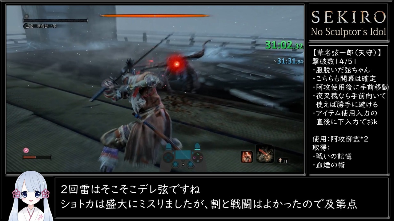 敵が強くなってきたので初投稿です。<br><br>■カテゴリー|All Bosses / Minibosses Glitchless<br>・心中の3体、修羅エンドの2体を除く全51体のボスを撃破する<br>・順番は任意<br>・計測はIGTで実施。RTは参考情報として同時計測<br>・その他、SRCのルールに準拠<br><br>■縛り|鬼仏の使用禁止<br>・身体力/攻め力の強化、スキルの取得、仏渡り、形代購入が不可<br>・アイテム、忍具、忍殺忍術、一部流派技とスキルは使用可能<br>・自動で起動する鬼仏およびチェックポイントへの帰還は可能<br>・怨嗟の鬼へ向かうための鬼仏は使用可能<br><br>前回|<a href="https://www.nicovideo.jp/watch/sm40498606" class="watch">sm40498606</a><br>次回|<a href="https://www.nicovideo.jp/watch/sm40571352" class="watch">sm40571352</a><br><br>無編集版|<a href="https://youtu.be/ayUKlWAdpVQ" target="_blank" rel="noopener nofollow">https://youtu.be/ayUKlWAdpVQ</a><br>Youtube版|<a href="https://youtu.be/QBzzCtgQPPc" target="_blank" rel="noopener nofollow">https://youtu.be/QBzzCtgQPPc</a><br><br>■Twitch<br><a href="https://www.twitch.tv/mizukiaihara" target="_blank" rel="noopener nofollow">https://www.twitch.tv/mizukiaihara</a><br>■YouTube<br><a href="https://www.youtube.com/channel/UCZA7VfDPNNPoxGDdoa4dxUg/" target="_blank" rel="noopener nofollow">https://www.youtube.com/channel/UCZA7VfDPNNPoxGDdoa4dxUg/</a><br>■Twitter<br><a href="https://twitter.com/mizuki_aihr" target="_blank" rel="noopener nofollow">https://twitter.com/mizuki_aihr</a><br><br>RTAとかゲーム関連|<a href="https://www.nicovideo.jp/series/280760" target="_blank" rel="noopener">series/280760</a><br>オリジナル曲とか音楽関連|<a href="https://www.nicovideo.jp/series/142252" target="_blank" rel="noopener">series/142252</a><br><br>解説音声:つくよみちゃん(COEIROINK)<br>イラスト素材:花兎*様|<a href="https://seiga.nicovideo.jp/seiga/im10746798" target="_blank" rel="noopener">im10746798</a><br>フリー素材キャラクターつくよみちゃん|<a href="https://tyc.rei-yumesaki.net/" target="_blank" rel="noopener nofollow">https://tyc.rei-yumesaki.net/</a>