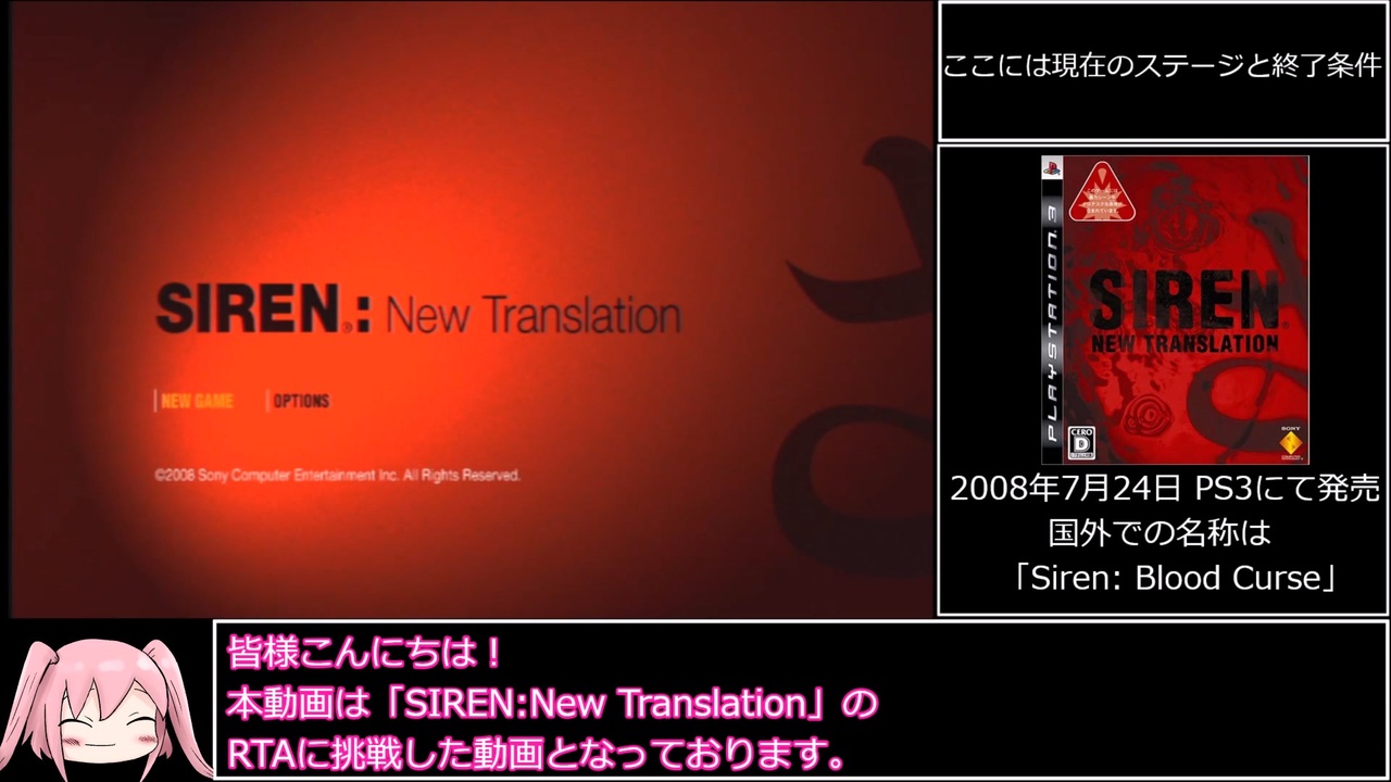 リスペクトRTA第6弾は<br>「SIREN: New Translation 」の Any%RTAです。<br>何なりとご覧下さい。<br><br>※動画のラスト10秒は何も編集していない余韻タイムです。見なくても大丈夫です。<br><br>プレイ環境 PS3 ディスク版<br><br>計測区間 チャプター1-1選択時~蚕子へのフェイタルムーブ発動時<br>スピードランドットコムのレギュレーションに則ります。<br><br>その他の条件については同じくスピードランドットコムの先駆者様に合わせます。<br>・難易度Normal<br>・初期セーブデータ<br>・チェックポイントロード有り<br>・バグ技の使用有り<br><br>part2 <a href="https://www.nicovideo.jp/watch/sm40535114" class="watch">sm40535114</a><br>part3 <a href="https://www.nicovideo.jp/watch/sm40535346" class="watch">sm40535346</a><br>無編集版 <a href="https://www.nicovideo.jp/watch/sm40534543" class="watch">sm40534543</a><br>本作のマイリスト <a href="https://www.nicovideo.jp/mylist/73238564" target="_blank" rel="noopener">mylist/73238564</a><br><br>挑戦、動画作成上でお世話になったノーハ氏の世界一位の記録⇒<a href="https://youtu.be/y-SVhkK97DE" target="_blank" rel="noopener nofollow">https://youtu.be/y-SVhkK97DE</a><br><br>立ち絵として使わせて頂いているゆっくりネモ <a href="https://seiga.nicovideo.jp/seiga/im10565710" target="_blank" rel="noopener">im10565710</a><br><br>RTA part1集 <a href="https://www.nicovideo.jp/mylist/68501814" target="_blank" rel="noopener">mylist/68501814</a><br>投稿者のTwitter <a href="https://twitter.com/pakishikun" target="_blank" rel="noopener nofollow">https://twitter.com/pakishikun</a>