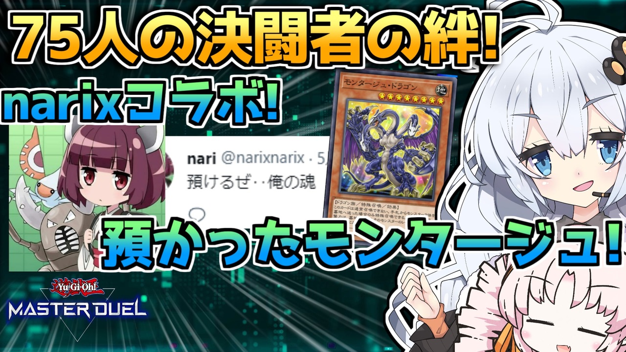 ー現代遊戯王が体感できる神ゲー「遊戯王マスターデュエル」の実況動画ー<br>☆三幻神を束ねることで召喚できる「光の創造神ホルアクティ」での先行ワンキルを求め続ける紲星あかりがマスターデュエルにもやってきた!!!<br>今回はLive2Dであかりちゃんが動く!<br><br>★「きりたんと300倍」シリーズをニコニコ動画にて投稿しているnarixさんとのコラボ動画!今回は75人の好きなカードだけでデッキを組む「魂のカード連合軍」企画でご本人から預かったモンタージュドラゴンが大活躍!?<br><br>★narixさん ユーザーページ:<a href="https://www.nicovideo.jp/user/1659101" target="_blank" rel="noopener">user/1659101</a><br> Twitter:<a href="https://twitter.com/narixnarix" target="_blank" rel="noopener nofollow">https://twitter.com/narixnarix</a><br><br>デッキ編成編➡<a href="https://www.nicovideo.jp/watch/sm40531266" class="watch">sm40531266</a><br>前➡<a href="https://www.nicovideo.jp/watch/sm40548342" class="watch">sm40548342</a><br>次➡<a href="https://www.nicovideo.jp/watch/sm40580049" class="watch">sm40580049</a><br>マイリスト→<a href="https://www.nicovideo.jp/mylist/68429101" target="_blank" rel="noopener">mylist/68429101</a><br><br>元ツイ➡<a href="https://twitter.com/shiki_yokosuka/status/1529314401727041538" target="_blank" rel="noopener nofollow">https://twitter.com/shiki_yokosuka/status/1529314401727041538</a><br>どのカードが誰の相棒かわかるよ(*'▽')<br><br>☆素材元様☆<br>立ち絵<br> 紲星あかり:みるくぱんだ 様<br> ついなちゃん:akihiyo 様<br> 東北きりたん:たしまん 様<br>BGM<br> 夏夜-kaya-:煉獄庭園 様<br /><br><span style="color: #434343; font-size: 10px;">ついったー:<a href="https://twitter.com/shiki_yokosuka" target="_blank" rel="noopener nofollow">https://twitter.com/shiki_yokosuka</a></span>