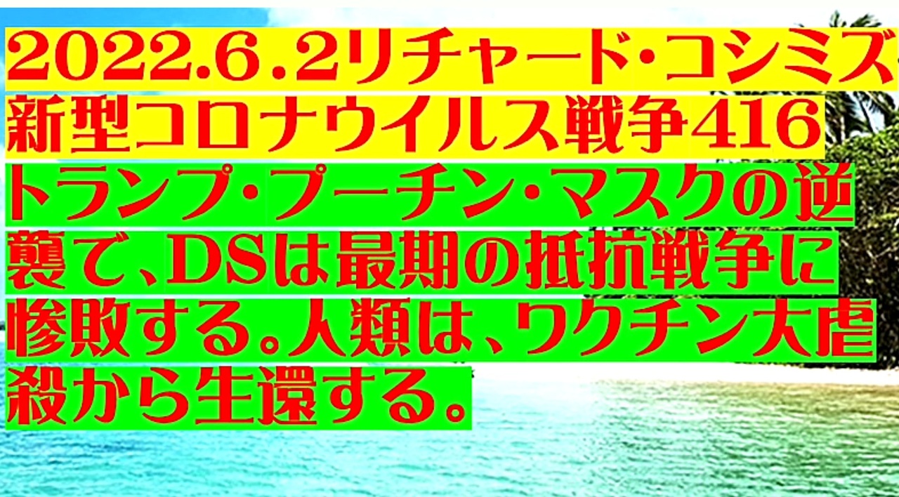 <span style="color: #cc4125;"><strong>「 テーマ:新型コロナウイルス戦争 416」</strong></span><br><br><span style="color: #ff0000;"><strong>「『 ドナルド・トランプ、ウラジーミル・プーチン、イーロン・マスク 』の逆襲で、<br> DEEP STATEは、最期の抵抗戦争に惨敗する。『 人類は、ワクチン大虐殺から生還する 』」</strong></span><br><br><strong>*「フォロー」・「ニコニ広告」・「いいね!」・「情報拡散」等、ご協力下さい。 リチャード・コシミズ</strong><br><br><span style="color: #38761d;">◆</span><span style="color: #38761d;"><strong>リチャード・コシミズ 公式 ブログ</strong></span><br> <a href="https://ameblo.jp/richardneversurrender/" target="_blank" rel="noopener nofollow">https://ameblo.jp/richardneversurrender/</a><br><br><span style="color: #38761d;">◆</span><span style="color: #38761d;"><strong>リチャード・コシミズ 公式 ホームページ<br> </strong></span><a href="http://richardkoshimizu.boo.jp/" target="_blank" rel="noopener nofollow">http://richardkoshimizu.boo.jp/</a><br><br><span style="color: #38761d;">◆</span><span style="color: #38761d;"><strong>リチャード・コシミズ 講演会 公式 動画ギャラリー</strong></span><br> <a href="http://www.t-sskk.com/richardkoshimizu/video-gallery/index.html" target="_blank" rel="noopener nofollow">http://www.t-sskk.com/richardkoshimizu/video-gallery/index.html</a><br>