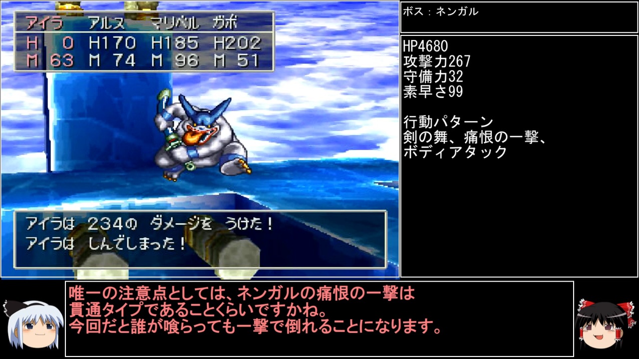 使えと言わんばかりに疾風のバンダナや風の帽子を提供してくる風の精霊編。<br>そして最終パーティの発表ですが、グランエスタードからダークパレスって近いですし一人が泳いでいけば五人でも戦えそうですね。<br><br>前→<a href="https://www.nicovideo.jp/watch/sm40528158" class="watch">sm40528158</a> 次→<a href="https://www.nicovideo.jp/watch/sm40600970" class="watch">sm40600970</a><br><br>YouTube版→<a href="https://youtu.be/T7jsksNW2uc" target="_blank" rel="noopener nofollow">https://youtu.be/T7jsksNW2uc</a><br><br><br>※動画の大きさが変わる方は、お手数ですが設定→画質を自動から〇pに変えると解決します。<br>※一部機種は互換機を使用してのプレイとなります。<br><br>縛りルール(不明点はシリーズのQ&Aを参照)<br>①使った武器・防具・装飾品・道具・呪文・特技・一部特殊施設(メダル王・カジノ・移民の町)・職業(3,6,7)・仲間モンスター(4,5,6,8+7の職業)は次以降のシリーズで使用禁止。<br>(NPCキャラが使用した装備や呪文を含む。売却及び錬金素材としても使用扱い)<br><br>②裏技・バグ技の禁止。<br><br>③逃走禁止&戦闘終了時は全員生存。<br><br>④レベルを上げ過ぎない。<br>ダンジョンやボスは公式ガイドブックに記載されたレベル+3まで。<br>ラスボスは全ての呪文を習得するレベル+3程度までに収める。<br><br>⑤裏ボスも規定回数、規定ターン以内に倒す。<br>(6の裏ダンジョン突入時のみ、条件を満たすため①の職業を解禁)<br><br>(おまけ)<br>宝は可能なものに限り全回収。<br>5と6は同一モンスターの仲間不可。<br>回避可能なボスも全て倒す。<br><br><br>この動画で利用している株式会社スクウェア・エニックスを代表とする共同著作者が権利を所有する著作物及びスギヤマ工房有限会社が権利を所有する楽曲の転載・配布は禁止いたします。<br>(C) ARMOR PROJECT/BIRD STUDIO/SQUARE ENIX All Rights Reserved.<br>(C) SUGIYAMA KOBO (P) SUGIYAMA KOBO<br><br>AquesTalk2ライセンスID:AQTK2WINUSR23122185<br /><br><br>❤いいねを押していただけるとモチベーションと投稿速度が上がるので宜しくお願い致します!<br><br>作者ツイッター→ <a href="https://twitter.com/nig0117" target="_blank" rel="noopener nofollow">https://twitter.com/nig0117</a><br>PIXIV FANBOX→ <a href="https://sutanokeiji.fanbox.cc/" target="_blank" rel="noopener nofollow">https://sutanokeiji.fanbox.cc/</a><br><br>( 以前はWEB小説書いてました→ <a href="https://kakuyomu.jp/works/1177354054884910267" target="_blank" rel="noopener nofollow">https://kakuyomu.jp/works/1177354054884910267</a> )