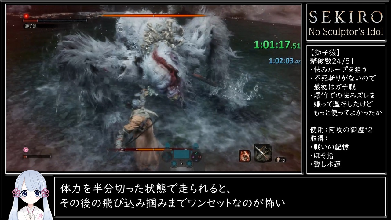 ガバが増えてきたので初投稿です。<br><br>■カテゴリー|All Bosses / Minibosses Glitchless<br>・心中の3体、修羅エンドの2体を除く全51体のボスを撃破する<br>・順番は任意<br>・計測はIGTで実施。RTは参考情報として同時計測<br>・その他、SRCのルールに準拠<br><br>■縛り|鬼仏の使用禁止<br>・身体力/攻め力の強化、スキルの取得、仏渡り、形代購入が不可<br>・アイテム、忍具、忍殺忍術、一部流派技とスキルは使用可能<br>・自動で起動する鬼仏およびチェックポイントへの帰還は可能<br>・怨嗟の鬼へ向かうための鬼仏は使用可能<br><br>前回|<a href="https://www.nicovideo.jp/watch/sm40527646" class="watch">sm40527646</a><br>次回|<a href="https://www.nicovideo.jp/watch/sm40613236" class="watch">sm40613236</a><br><br>無編集版|<a href="https://youtu.be/ayUKlWAdpVQ" target="_blank" rel="noopener nofollow">https://youtu.be/ayUKlWAdpVQ</a><br>Youtube版|<a href="https://youtu.be/obYwE0WfvL8" target="_blank" rel="noopener nofollow">https://youtu.be/obYwE0WfvL8</a><br><br>■Twitch<br><a href="https://www.twitch.tv/mizukiaihara" target="_blank" rel="noopener nofollow">https://www.twitch.tv/mizukiaihara</a><br>■YouTube<br><a href="https://www.youtube.com/channel/UCZA7VfDPNNPoxGDdoa4dxUg/" target="_blank" rel="noopener nofollow">https://www.youtube.com/channel/UCZA7VfDPNNPoxGDdoa4dxUg/</a><br>■Twitter<br><a href="https://twitter.com/mizuki_aihr" target="_blank" rel="noopener nofollow">https://twitter.com/mizuki_aihr</a><br><br>RTAとかゲーム関連|<a href="https://www.nicovideo.jp/series/280760" target="_blank" rel="noopener">series/280760</a><br>オリジナル曲とか音楽関連|<a href="https://www.nicovideo.jp/series/142252" target="_blank" rel="noopener">series/142252</a><br><br>解説音声:つくよみちゃん(COEIROINK)<br>イラスト素材:花兎*様|<a href="https://seiga.nicovideo.jp/seiga/im10746798" target="_blank" rel="noopener">im10746798</a><br>フリー素材キャラクターつくよみちゃん|<a href="https://tyc.rei-yumesaki.net/" target="_blank" rel="noopener nofollow">https://tyc.rei-yumesaki.net/</a>