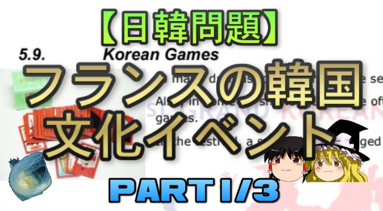 さて、今回は2009年から2012年にかけてフランスで開催されていた韓国文化イベントについて扱っていきます。<br>間に合っていないような気がしたが気のせいだった<br><br>本日のブログ記事<br><a href="https://oogchib.hateblo.jp/entry/2022/06/05/002902" target="_blank" rel="noopener nofollow">https://oogchib.hateblo.jp/entry/2022/06/05/002902</a><br><br>関連記事<br>「Japan Expoに寄生しないで独自のコリアエキスポやればいいのに」→過去にやった事があります<br><a href="https://oogchib.hateblo.jp/entry/ar565115" target="_blank" rel="noopener nofollow">https://oogchib.hateblo.jp/entry/ar565115</a><br><br>関連動画<br>【日韓問題】フランスのJapan Expoと韓国の問題 前編<br><a href="https://www.nicovideo.jp/watch/sm31493408" class="watch">sm31493408</a><br>【ゆっくり解説】韓国が韓流を始めた理由 part1/2<br><a href="https://www.nicovideo.jp/watch/sm38944520" class="watch">sm38944520</a><br>【日韓問題】韓国起源説全般の解説 前編<br><a href="https://www.nicovideo.jp/watch/sm32789962" class="watch">sm32789962</a><br>【ゆっくり解説】韓国起源説-Strikes Back- part1/2<br><a href="https://www.nicovideo.jp/watch/sm38777074" class="watch">sm38777074</a><br>韓国人とテコンドー<br><a href="https://www.nicovideo.jp/watch/sm38097103" class="watch">sm38097103</a><br><br>引用ソースと動画のテキストをブログ日韓問題(初心者向け)のほうへ掲載しています。<br><br>日韓問題(初心者向け)<br><a href="https://oogchib.hateblo.jp/" target="_blank" rel="noopener nofollow">https://oogchib.hateblo.jp/</a><br>移転前旧ブログ<br><a href="https://ch.nicovideo.jp/ooguchib/blomaga" target="_blank" rel="noopener nofollow">https://ch.nicovideo.jp/ooguchib/blomaga</a><br><br>暇つぶしにどうぞ<br><a href="http://ooguchib.blog.fc2.com/" target="_blank" rel="noopener nofollow">http://ooguchib.blog.fc2.com/</a> <br><br>twitter @ooguchib<br><a href="https://twitter.com/ooguchib" target="_blank" rel="noopener nofollow">https://twitter.com/ooguchib</a><br><br>前 <a href="https://www.nicovideo.jp/watch/sm40536866" class="watch">sm40536866</a> <a href="https://www.nicovideo.jp/mylist/59069876" target="_blank" rel="noopener">mylist/59069876</a> 次回 来週<br><br>番外編マイリスト<br><a href="https://www.nicovideo.jp/mylist/62992608" target="_blank" rel="noopener">mylist/62992608</a><br><br>YouTube版<br><a href="https://youtu.be/PducDPZ89X4" target="_blank" rel="noopener nofollow">https://youtu.be/PducDPZ89X4</a><br>