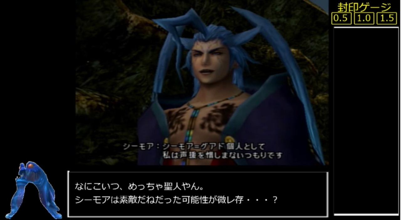 FF10封印縛り、パート20前後で終わるかなあ?<br>8 ジョゼ寺院<br>9 リュック加入<br>10 グアド<br>11 シーモア1<br>12 砂漠<br>13 アルベドホーム<br>14 襲撃<br>15 イサール<br>16 ナギ平原<br>17 ガガゼト山<br>18 ザナルカンド遺跡<br>19 ユウナレスカ<br>20 シン<br>21 シーモア4<br>22 ラスダン<br>23 ラスボス<br>なんとか、いけるか!?<br><br>縛り内容<br>・レベルが1.5上がる度にランダムでアイテム・召喚獣・トリガーコマンド・オーバードライブ技・アビリティ(白黒魔法使う調合等の大枠以外)が1つ封印される。<br> (武器が全封印されたキャラは物理攻撃禁止)<br>・初めて探索する区間(セーブスフィア間)は逃走禁止。ボスは試行回数殴りOK。<br>・全滅時、経験値(AP)を再現。<br>・戦闘終了時、全員がAPを取得する(APありの戦闘のみ)。無理な場合、1人死亡につき3封印。<br><br>(封印対象物について)<br>武防具アビリティ「APなし」・「エンカウントなし」・アビリティ「とんずら」「わいろ(稼ぎ以外での使用)」は禁止。<br>武防具は改造前の名称を封印対象とする。改造後の名称の使用可否は、改造前に準ずる。<br> ex)アーロンの武器の場合、スロット数の異なるベース武器×3&捕獲武器&七曜の武器の5種類となる。<br> スフィアは基本パラメータUP4種とキースフィアのみ、封印されてもスフィア盤での使用は可。<br><br>リスペクト元(封印王) → <a href="https://www.nicovideo.jp/watch/sm4569128" class="watch">sm4569128</a><br><br>過去シリーズ → <a href="https://www.nicovideo.jp/mylist/71307387" target="_blank" rel="noopener">mylist/71307387</a><br>告知 → <a href="https://twitter.com/mazoriahosh" target="_blank" rel="noopener nofollow">https://twitter.com/mazoriahosh</a><br>youtube → <a href="https://www.youtube.com/watch?v=qskHDlLNypY" target="_blank" rel="noopener nofollow">https://www.youtube.com/watch?v=qskHDlLNypY</a><br><br>次回投稿予定日 6/12
