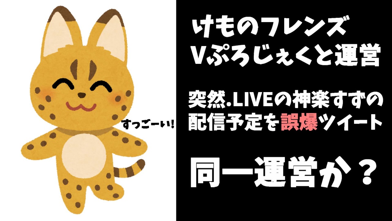 2022年6月5日13時ごろ、けものフレンズVぷろじぇくとの公式運営アカウントが突然/LIVE所属の神楽すずさんの配信予定をツイートしました。その後、そのツイートはすぐに削除されたのですが、ほぼ同じ文言を.LIVEマネージャー部で改めてツイート。そのことからけもV運営は.LIVEなのではという疑惑が上がっています。<br><br>引用<br><a href="https://twitter.com/manager_bu/status/1533301999726276608" target="_blank" rel="noopener nofollow">https://twitter.com/manager_bu/status/1533301999726276608</a><br><br>今後の 製作予定動画<br>壱百満天原サロメは何故圧倒的人気ライバーになったのか?<br>元にじさんじ運営幹部いわなが社長、新しい箱を立ち上げる<br>【悲報】鳴神裁「裁判をすっ飛ばして逮捕はあり得ない」<br>にじさんじ引退者まとめPart.3<br>【悲報】にじさんじライバー、一本満足バーを一度に二本食べてしまう<br><br>Youtube <a href="https://www.youtube.com/channel/UCzYQPx8MeE99DUkW9Y_txJw" target="_blank" rel="noopener nofollow">https://www.youtube.com/channel/UCzYQPx8MeE99DUkW9Y_txJw</a><br>twitter <a href="https://twitter.com/V_Virgin_Mary" target="_blank" rel="noopener nofollow">https://twitter.com/V_Virgin_Mary</a><br><br>使用素材<br>高品質なフリー動画素材 - Pixabay <a href="https://pixabay.com/ja/videos" target="_blank" rel="noopener nofollow">https://pixabay.com/ja/videos</a><br>いらすとや様 <a href="https://www.irasutoya.com/" target="_blank" rel="noopener nofollow">https://www.irasutoya.com/</a>