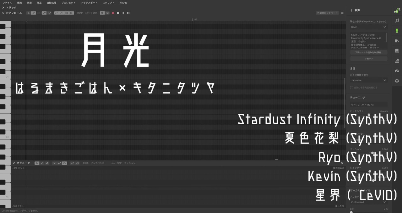 ハチナナです。<br>星尘Infinity・夏色花梨・Ryo・Kevin・星界ではるまきごはんさん×キタニタツヤさんの月光をカバーさせていただきました!<br><br>本家様→<a href="https://www.nicovideo.jp/watch/sm40545552" class="watch">sm40545552</a><br><br>MIX:侑凪 継(@Kei_Yunagi)<br>調声:ハチナナ(@SevgasakiEight)<br><br>ust / vsqx (ベタ打ち) → <a href="https://bowlroll.net/file/278895" target="_blank" rel="noopener nofollow">https://bowlroll.net/file/278895</a><br><br>欠乏(<a href="https://www.nicovideo.jp/watch/sm40579285" class="watch">sm40579285</a>)←前 次→夜に駆ける(<a href="https://www.nicovideo.jp/watch/sm40628403" class="watch">sm40628403</a>)<br>他の投稿動画 → <a href="https://www.nicovideo.jp/mylist/38415447" target="_blank" rel="noopener">mylist/38415447</a><br><br>画面出してるけどCeVIO AIのピッチベンドの線がどっちが編集後かわかりません<br /><br>-----------------<br>ボーカルを派遣します。オリジナル曲等を歌わせてみませんか?<br>調声依頼について → hachinana-tuning.amebaownd.com<br>