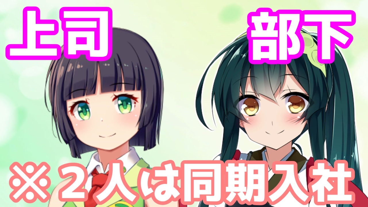 <span style="color: #ff9900;"><strong>いいね!に個人的同期あるあるを入れております<br>皆さん的にはどうでしょうか</strong></span><br><br>同期入社、それは仲間であり、ライバルであり<br>けっこう複雑な存在かもしれませんね<br>今回はそんな「同期あるある」を一つのストーリーに沿ってまとめました<br><br>※セイカフェス2022参加作品です<br><br><span style="font-size: 10px;">◆ソフトウェアに関する特記<br>VOICEVOX:ずんだもん・四国めたん<br>◆立ち絵<br>blueberry さん / 京町セイカ【キャラ素材】<br>blueberry さん / 東北きりたん【キャラ素材】<br>MtU さん / 東北ずん子さん立ち絵素材ver2.0<br>シルエットAC さん / ビジネスマン / ビジネスウーマン<br>◆BGM<br>MATSU さん / Shall we meet?<br>◆画像<br>野田工房アニソンカラオケ制作室 さん / 【素材】黒板<br>ぬれよん-色が塗れる無料イラスト素材 さん / 色塗りできる勉強机・事務用デスクのイラスト<br>illalet さん / 黒いノートパソコンの背面のイラスト<br>イラストAC さん / イラスト素材:時計 〜時 アナログ セット<br>フキダシデザイン さん / シンプルなふきだしなフキダシ12<br>来夢来人 さん / 電話マークのフリー素材<br>ActivePhotoStyle さん / 居酒屋-掘りごたつの席<br>ぱくたそ さん / フレンチレストランのテーブルセットの写真素材<br>◆効果音<br>効果音ラボ さん / ドアを開ける1<br>OtoLogic さん / 本02 / PC キーボード02</span><br />***<span style="font-size: 10px;">共通メッセージ 最終更新2024/12/31</span><br><span style="color: #ff9900;"><strong>★今後の投稿予定のご案内(変更の可能性があります)</strong></span><br>定期的に投稿する予定ですので、よろしければフォローよろしくお願いします<br><br><span style="font-size: 10px;">現在のストック一覧</span><br><span style="font-size: 10px;"><u>メインシリーズ(7) 3か月に1本ずつ公開予定です</u></span><br><span style="font-size: 10px;">・サービス残業をする理由解説<br>・会社辞める人あるある<br>・短所を長所に置き換え リフレーミング解説<br>・クソ会議あるある<br>・職場の働き方改革あるある<br>・職場の喫煙事情あるある<br>・職場のeラーニングあるある</span>