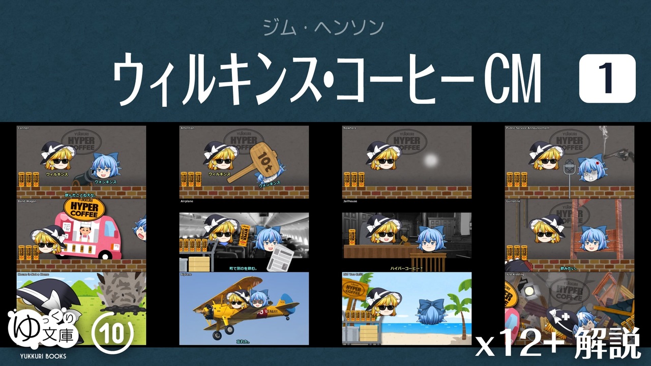 <span style="color: red;"><strong>111 毒や刺激は娯楽の基本──</strong></span><br>65年前に一世風靡した毒のあるCMを、饅頭再現しました。あわせてマペット、ジム・ヘンソンについてちょっと解説。オリジナルCMも添付。<br><span style="color: green;">Wilkins Coffee CM (1957) by Jim Henson</span><br>※ハイパーコーヒー:文庫界隈にたびたび登場する甘い缶コーヒー。素材→ <a href="https://seiga.nicovideo.jp/seiga/im10971976" target="_blank" rel="noopener">im10971976</a><br><br>(うp主より)<br>ゆっくり茶番劇のつもりで作ったんだけど・・・これじゃなかった?<br>編集後記:<a href="https://trynext.com/story/ybook/yb111.php" target="_blank" rel="noopener nofollow">https://trynext.com/story/ybook/yb111.php</a><br><a href="https://www.nicovideo.jp/watch/sm40029962" class="watch">sm40029962</a> 【筋之助】ゆっくりのストーリーテラー「恐れ知らず」<br><br>●ウィルキンス・コーヒーCM<br><a href="https://www.nicovideo.jp/watch/sm40596752" class="watch">sm40596752</a> <span style="color: #ff00ff;"><strong>01-12</strong></span><br>01. Cannon<br>02. Attention<br>03. Nowhere<br>04. Public Service Announcement<br>05. Band Wagon<br>06. Airplane<br>07. Jailhouse<br>08. Guillotine<br>09. House is Not a Home<br>10. Biplane<br>11. Did You Call?<br>12. Just Kidding<br><br><a href="https://www.nicovideo.jp/watch/sm40628213" class="watch">sm40628213</a> 13-24<br>13. Anti-Violence<br>14. Good, Better, Best<br>15. Electric Chair<br>16. Cash Register<br>17. Submarine<br>18. Car Salesman<br>19. Steamroller<br>20. William Tell<br>21. Camera<br>22. Crystal Ball<br>23. Fair Damsel<br>24. Cannibals<br><br>●10秒動画 <a href="https://www.nicovideo.jp/mylist/77036276" target="_blank" rel="noopener">mylist/77036276</a><br>←<a href="https://www.nicovideo.jp/watch/sm40356380" class="watch">sm40356380</a> 契りおく その言の葉に 身を替えて<br>→<a href="https://www.nicovideo.jp/watch/sm40628213" class="watch">sm40628213</a> ウィルキンス・コーヒーCM 13-24<br><br>●ゆっくり文庫について<br>全部:<a href="https://www.nicovideo.jp/mylist/74874627" target="_blank" rel="noopener">mylist/74874627</a><br>近況:<a href="https://twitter.com/trynext" target="_blank" rel="noopener nofollow">https://twitter.com/trynext</a><br>---<br><br><br>