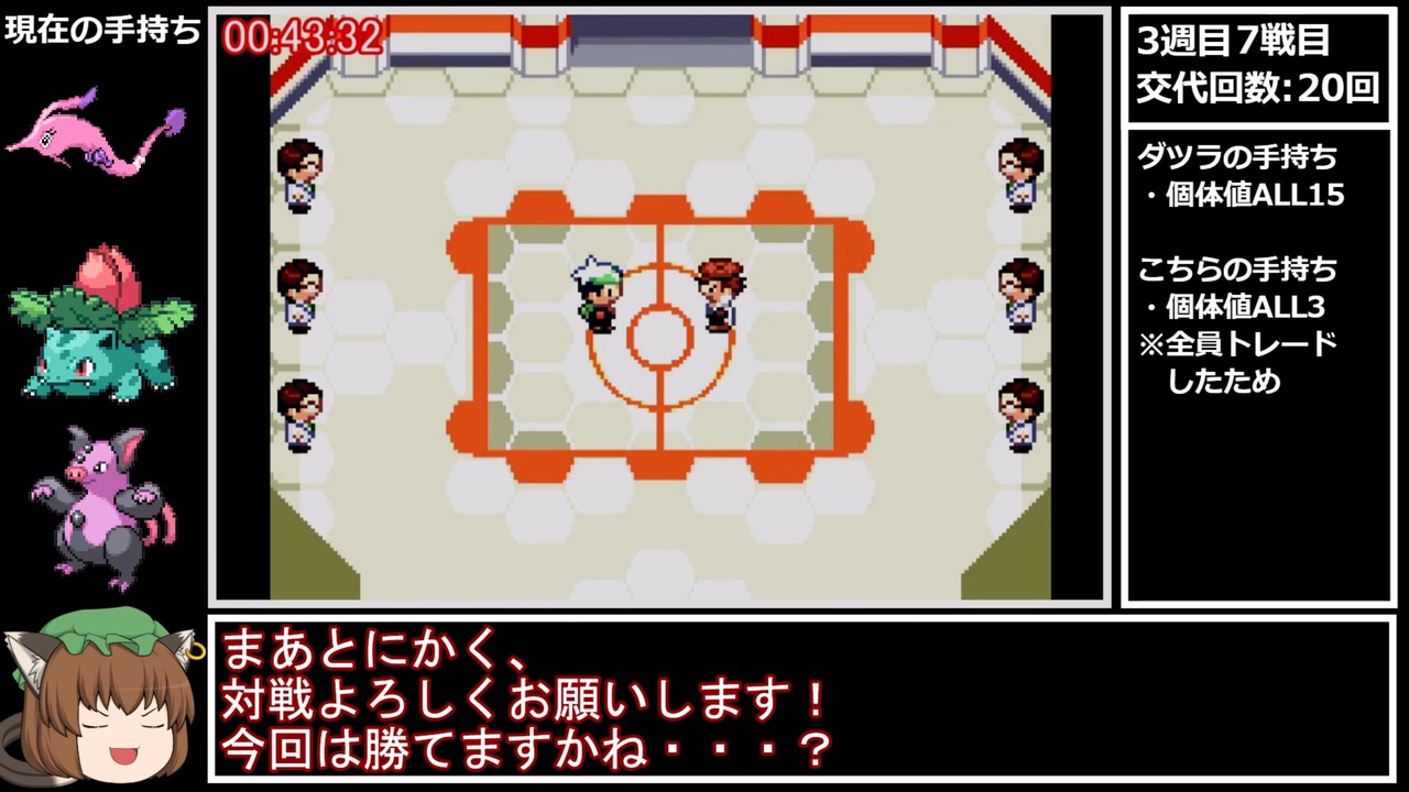 ↑そして何より意表がつける<br><br>前:<a href="https://www.nicovideo.jp/watch/sm40587817" class="watch">sm40587817</a><br>次:<a href="https://www.nicovideo.jp/watch/sm40608920" class="watch">sm40608920</a><br><br>計測区間<br>・タイマースタート:0勝状態でバトルファクトリーの受付に話しかけた瞬間<br>・タイマーストップ:42戦目(金ダツラ)で3体目を倒した瞬間<br><br>レギュレーションなど<br>・使用機種:レトロフリーク<br>・シングルバトル/レベル50<br>・21戦目は必ずダツラとバトル<br>・乱数調整禁止(ゲームリセット/バトルビデオを見る等)<br>・QL/QS/任意コード/チート等禁止<br><br>RTAまとめ:<a href="https://www.nicovideo.jp/mylist/56827667" target="_blank" rel="noopener">mylist/56827667</a><br>更新報告:<a href="https://twitter.com/yamabukiginu" target="_blank" rel="noopener nofollow">https://twitter.com/yamabukiginu</a><br><br>追記<br>今回こそ明度は大丈夫なはず・・・はず・・・
