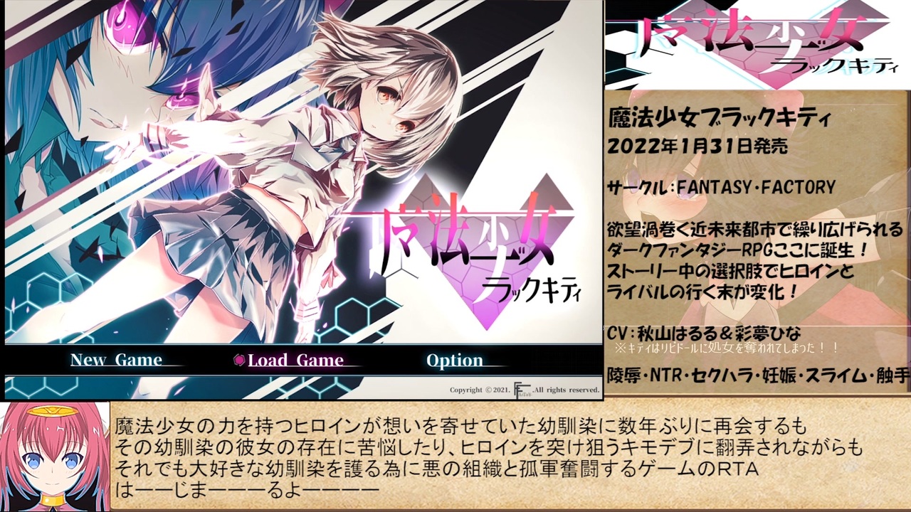 何回「ま○こ」言うねん・・・<br><br><br>【FANTASY FACTORY】様制作<br>「魔法少女ブラックキティ」ラスボス撃破までのRTAをさせて頂きました。<br><br>○~あらすじ~○<br>欲望で世界を支配しようとする悪の組織「サーカス」<br>欲望を糧に成長するリビドールは人々の心に恐怖を落とし、希望を殺す。<br>しかしそれを切り裂き人々に希望の光をもたらさんとする存在があった。<br>それは「魔法少女・ガール」<br>数年ぶりに日本の地へ帰ってきた「魔法少女ブラックキティ」は<br>かつて自分が住み、想い人がいた街を護らんと<br>独り「サーカス」に戦いを挑むのだった・・・<br><br><span style="font-size: 18px;"><strong><u>人は何故落ちるのか、それは這い上がる為だ・・・</u></strong></span><br><br>欲望渦巻く近未来都市で繰り広げられるダークヒロインファンタジーRPGゲームここに完成!!<br><br><br>作品リンクはこちら!買うなら今!!<br><br><span style="color: #ff0000; font-size: 18px;"><strong><i>祝!!「魔法少女ブラックキティ」販売数16,797本突破!!</i></strong></span><span style="color: #ff0000; font-size: 18px;"><strong>!(2022年6月10日時点)</strong></span><br><br><br><br>美少女シスター陵辱RTAマイリスト→<a href="https://www.nicovideo.jp/mylist/71433234" target="_blank" rel="noopener">mylist/71433234</a><br>ドスケベくノ一陵辱RTAマイリスト→<a href="https://www.nicovideo.jp/mylist/71433237" target="_blank" rel="noopener">mylist/71433237</a><br>美少女エスパー陵辱RTAマイリスト→<a href="https://www.nicovideo.jp/mylist/71453605" target="_blank" rel="noopener">mylist/71453605</a><br>正義の魔法少女陵辱RTAマイリスト→<a href="https://www.nicovideo.jp/mylist/72027465" target="_blank" rel="noopener">mylist/72027465</a><br>ムチムチな天使陵辱RTAマイリスト→<a href="https://www.nicovideo.jp/mylist/72196860" target="_blank" rel="noopener">mylist/72196860</a><br>正義のヒロイン陵辱RTAマイリスト→<a href="https://www.nicovideo.jp/mylist/72424512" target="_blank" rel="noopener">mylist/72424512</a><br>ダークヒロイン陵辱RTAマイリスト→<a href="https://www.nicovideo.jp/mylist/72392739" target="_blank" rel="noopener">mylist/72392739</a><br><br>Twitter ID→@Duce_Ishizawa