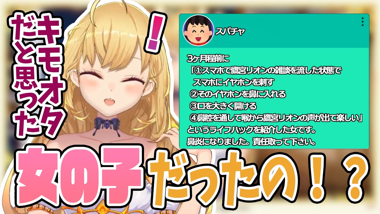 キモオタであることと女の子であることは余裕で両立できるから…<br><br><br><br> 〇元動画↓ <br>ヤバyばやばhfげbyなうdfbgrwのkしゃbなやばyばやbあ【キレ雑/鷹宮リオン にじさんじ】 <a href="https://www.youtube.com/watch?v=EK9S_bIKbAo" target="_blank" rel="noopener nofollow">https://www.youtube.com/watch?v=EK9S_bIKbAo</a> <br>バレンタインを漆黒に塗りつぶしてやろうよスペシャル【にじさんじ/鷹宮リオン】 <a href="https://www.youtube.com/watch?v=A90RvamqCbc" target="_blank" rel="noopener nofollow">https://www.youtube.com/watch?v=A90RvamqCbc</a> <br><br>-------------------------------------------------- <br>〇登場ライバー <br>鷹宮リオン / Rion Takamiya <br><a href="https://www.youtube.com/channel/UCV5ZZlLjk5MKGg3L0n0vbzw" target="_blank" rel="noopener nofollow">https://www.youtube.com/channel/UCV5ZZlLjk5MKGg3L0n0vbzw</a> <br><br>------------------------------------------------