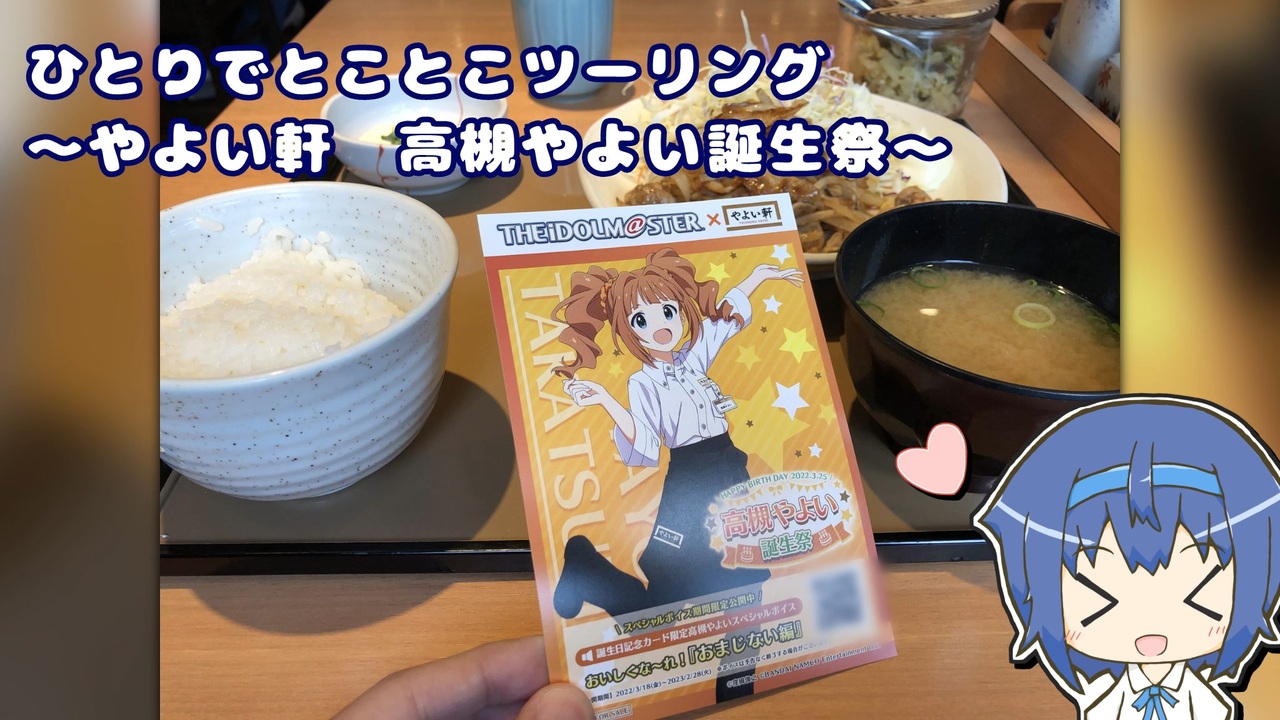 3月25日の高槻やよい誕生祭に合わせて、やよい軒とアイマスのコラボがありました。<br><br><strong>・【765】「高槻やよい」×「やよい軒」コラボイベント情報公開!3月上旬より順次スタート!</strong><br> <a href="https://idolmaster-official.jp/news/01_3550.html" target="_blank" rel="noopener nofollow">https://idolmaster-official.jp/news/01_3550.html</a><br> 今まではやよい軒高槻店が非公式で行っていましたが、今回は公式ですよ、プロデューサー!<br><br> ってことで、今更ですが行ったときの様子を動画にしてみました(3か月遅れはPとしてどうなんでしょうか)。<br> やよいちゃんは、アケマス(アーケード版)からの担当Pで、箱マスを経て現在はポプマスでやよい中心でユニットを組んでいるぐらいは好きなキャラです。<br> 余談ですが、バイクのキーホルダーはやよいちゃんのラバストで、今年のふるさと納税は観光大使をしている高槻市に突っ込みました。<br><br> 来年もまたコラボして欲しいなぁと願っているPは多いはずなので、やよい軒さん、よろしくお願いします。あと高槻市もありがとうございます!いつか行きます!<br />■車載動画 <a href="https://www.nicovideo.jp/series/5592" target="_blank" rel="noopener">series/5592</a><br> 番外編 <a href="https://www.nicovideo.jp/series/403721" target="_blank" rel="noopener">series/403721</a><br>■ユーザページ <a href="https://www.nicovideo.jp/user/347413" target="_blank" rel="noopener">user/347413</a>